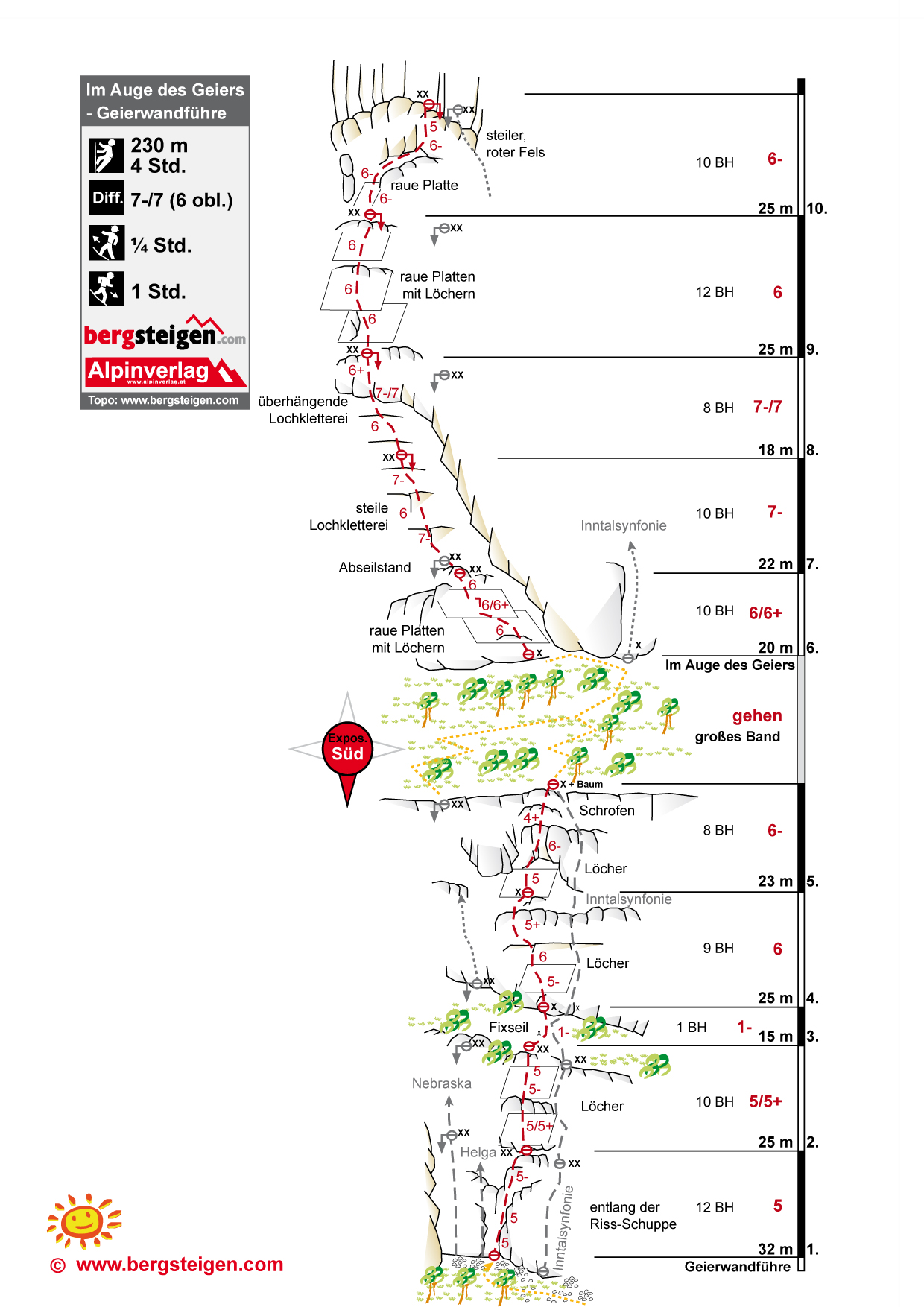 Schöne Routenkombination an der Geierwand, aber im oberen Teil schwer. Man muss schon etwas Ausdauer im 7ten Grad haben, um solide bis ganz hinauf zu kommen. Die Kombi „Geierwandführe“ und „Im Auge des Geiers“ ist aber nicht ganz so anspruchsvoll wie die „Nebraska“. Achtung: Die Route endet in der Wandmitte - man muss auf jeden Fall abseilen!