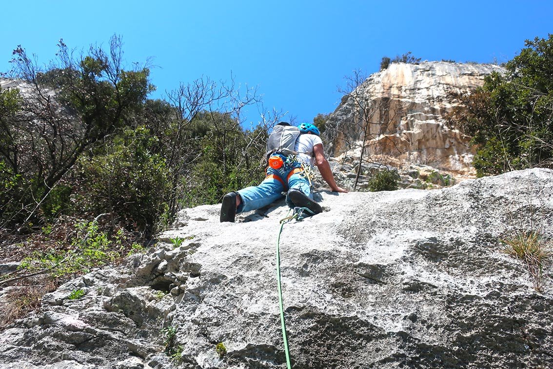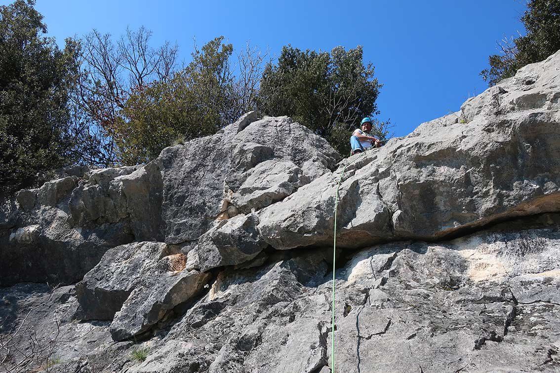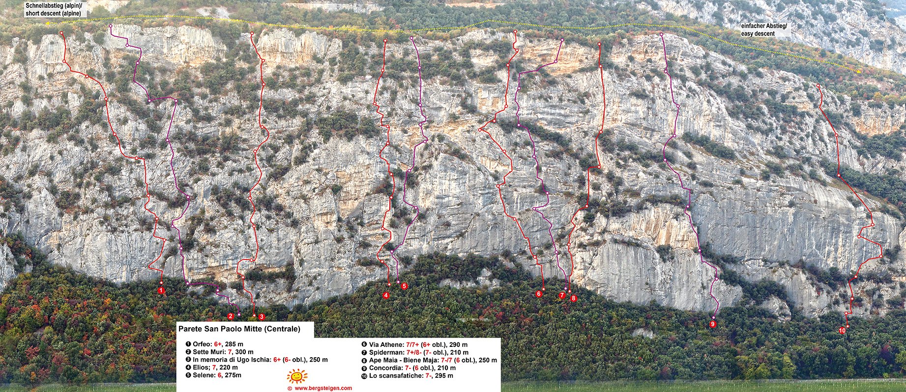 Der Anstieg In memoria di Ugo Ischia ist eine wirklich gut gebaute Route im zentralen Teil der Parete San Paolo. Unten schlängelt sich die Route geschickt zwischen den Überhängen durch, im Mittelteil muss die plattige Schlüsselstelle, an der nur ein Normalhaken steckt, gemeistert werden. Im oberen Teil wird man mit schöner, nicht allzu schwieriger Kletterei bis zum Ausstieg belohnt. Unten, an den Überhängen, wurden Steingriffe an den Fels geklebt - auch dort wo gar keine Griffe waren - so kann man diese Stelle auch als 6er-Kletterer ohne Haken Benützung bewältigen. Der Anstieg ist trotz des kleinen Ethik-Problems sehr zu empfehlen und auch noch nicht ganz so abgeklettert wie andere, ähnlich schwierige Routen an der San Paolo Felswand.