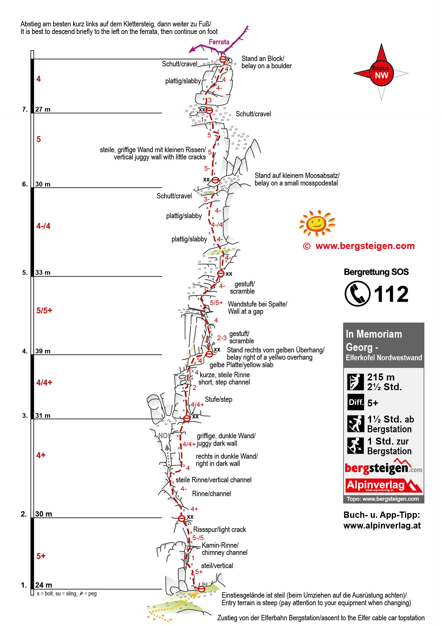 Vom Ende der Route links auf dem Klettersteig ein paar Minuten absteigen, dann zu Fuß zurück zur Elferhütte und von dort hinunter zur Kabinenbahn.