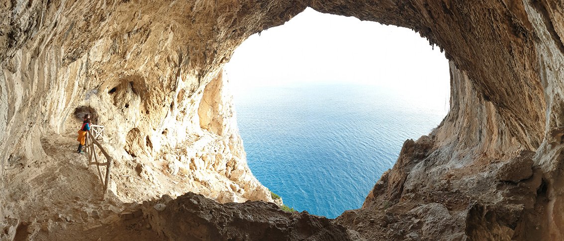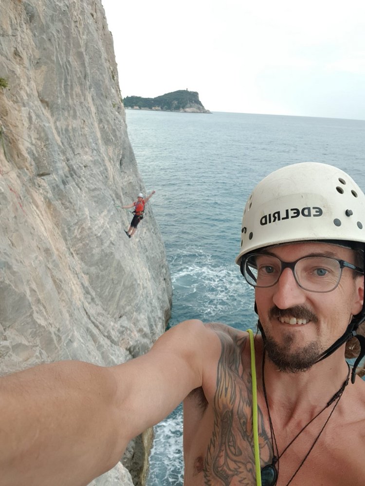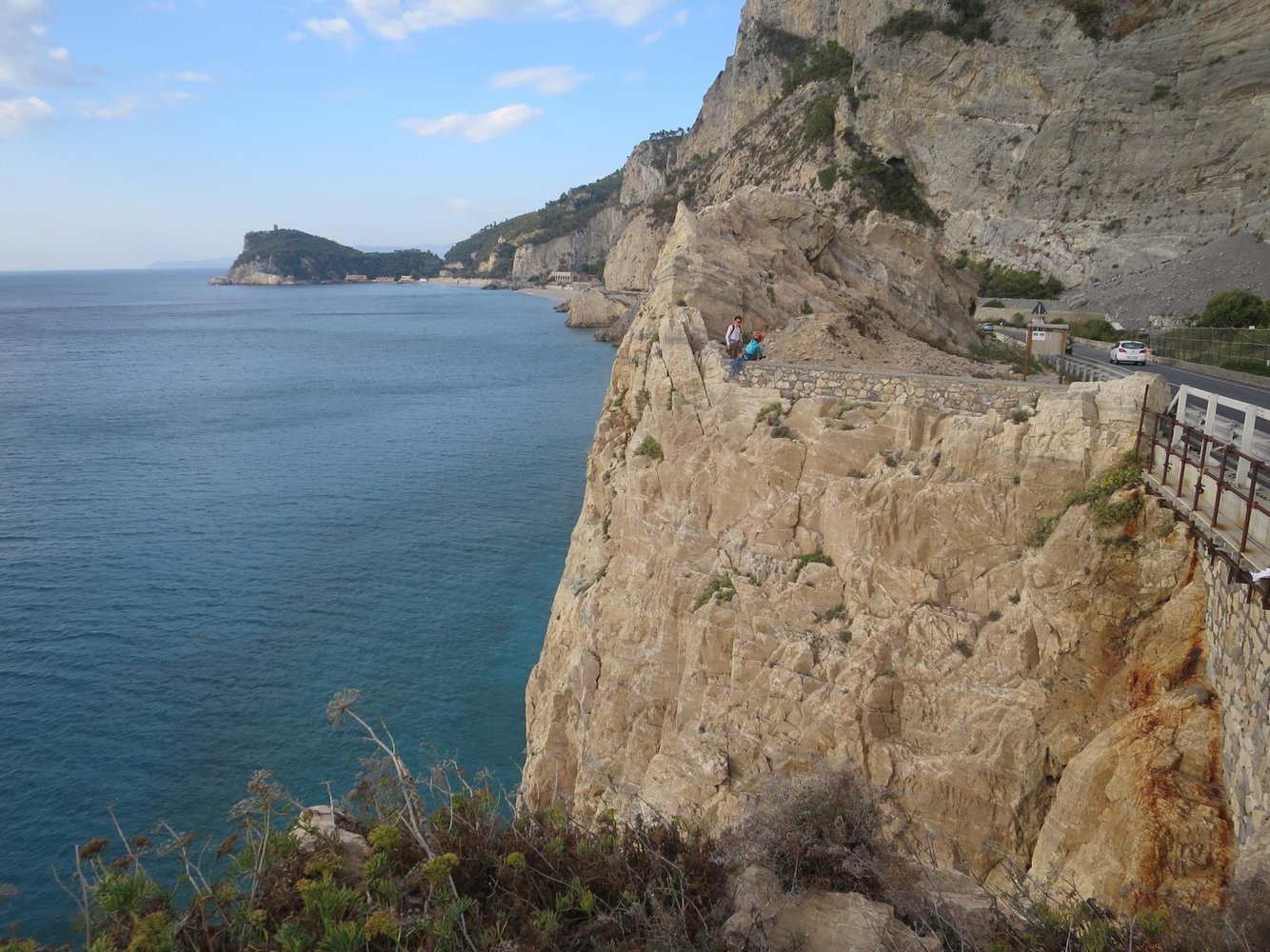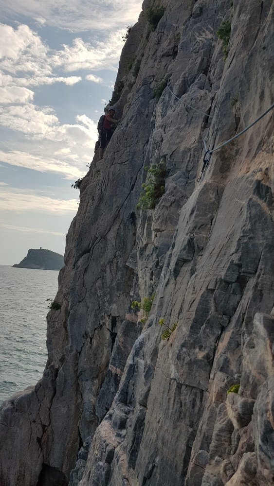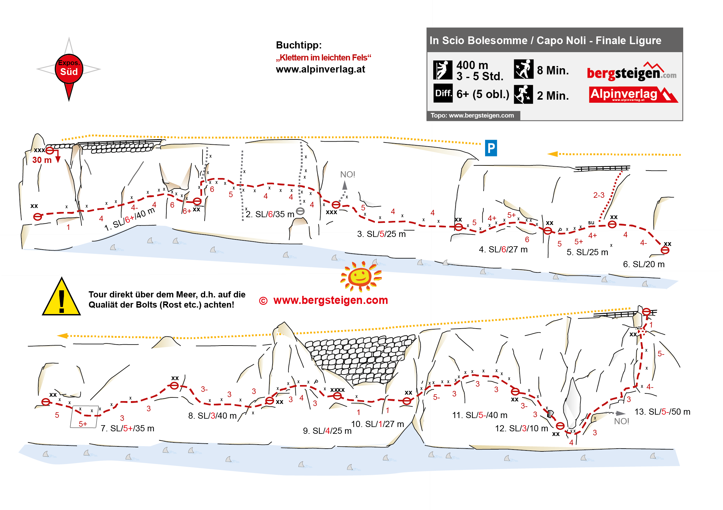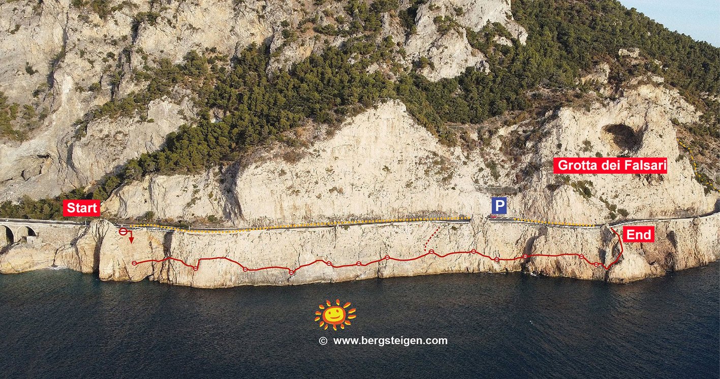 Tipp: Man kann sich dort auch gleich die Grotta dei Falsari anschauen, man sieht die bekannte Höhle gut vom Ausstieg oberhalb der Straße. Zustieg: Auf der Straße um die Felskante in Richtung Noli, dann hinter einem Steinfangzaun durch den Buschwald auf Pfadspuren hinauf zum Einstiegsloch der Grotta dei Falsari (Zeitbedarf ca. 15 Minuten bis zur Höhle).