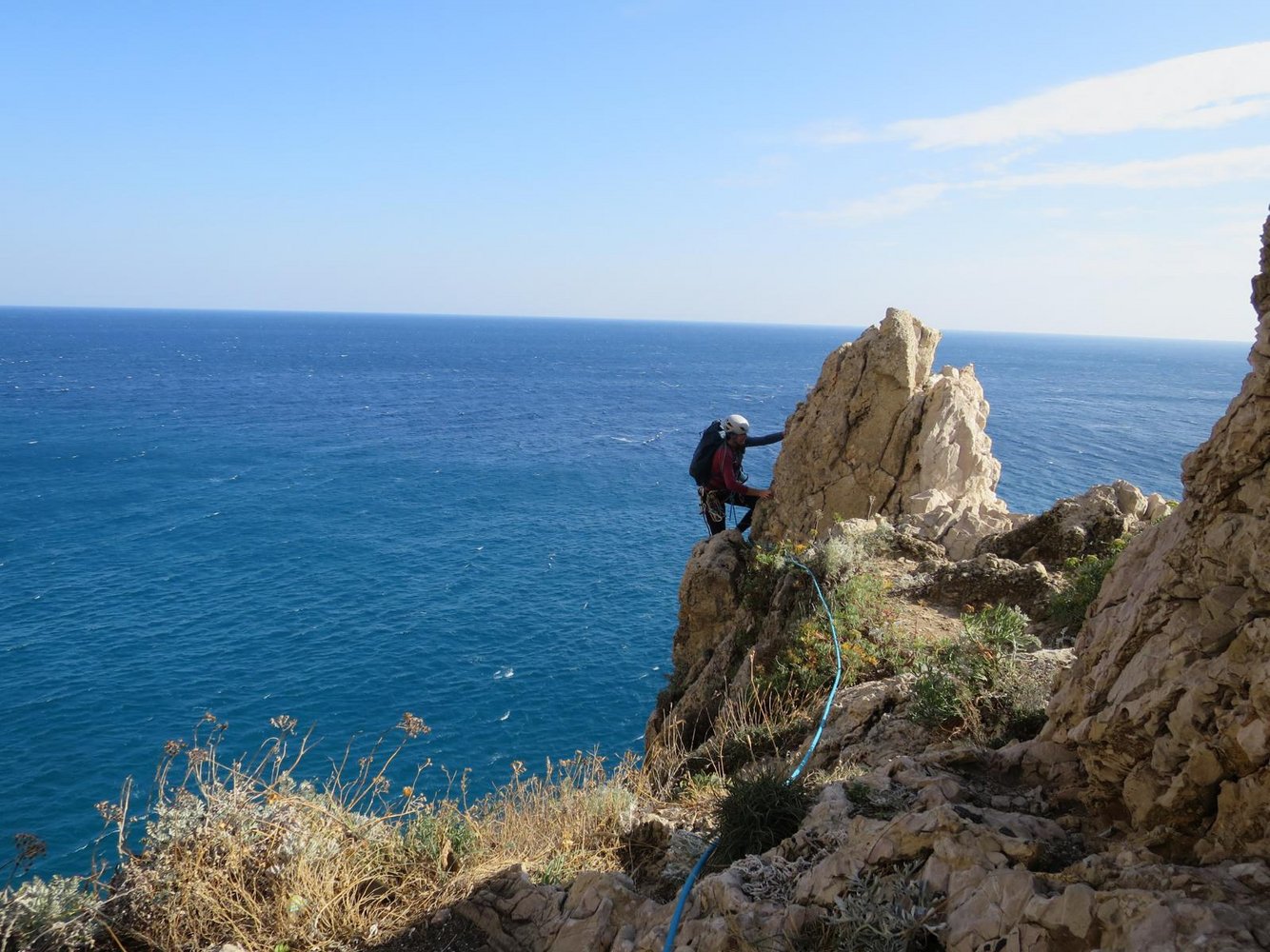 Vom Parplatz der Straße zurück Richtung Finale zum Abseilpunkt bei einem Felsvorsprung mit ebenen Platz und kleiner Steinmauer - siehe Karte. Am Ende der Mauer sind drei Bohrhaken zum Abseilen vorhanden.