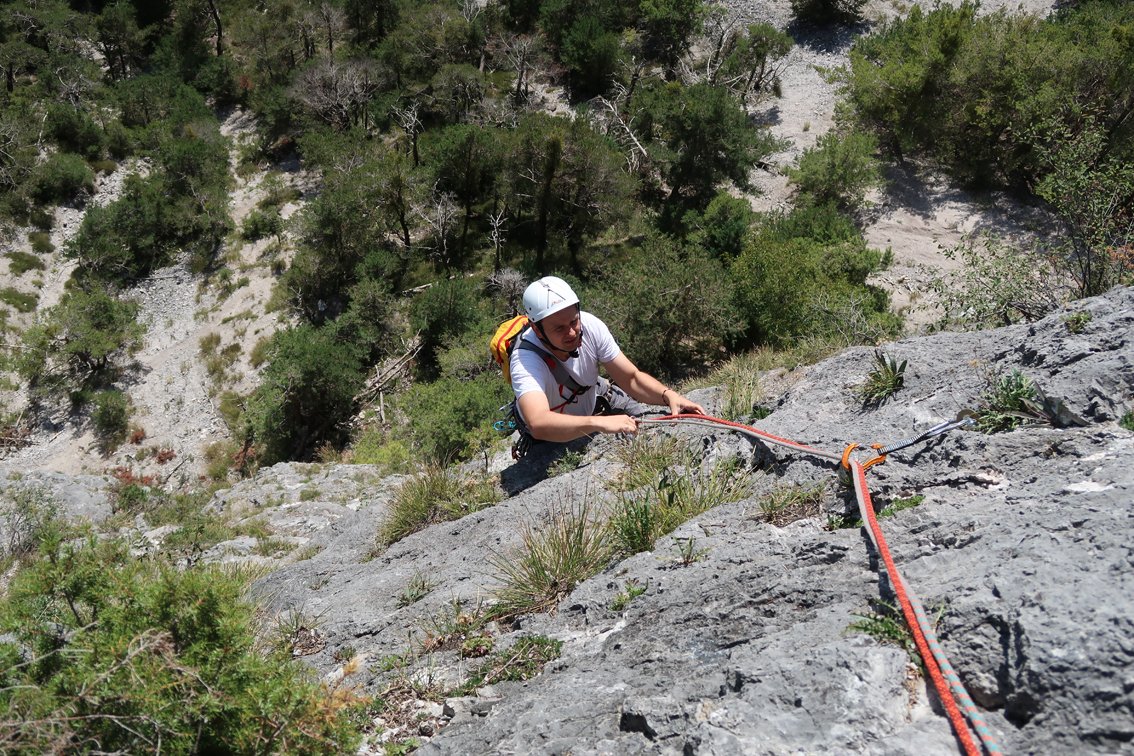 Vom Ende der Tour seilt man sich wieder auf das große Band ab. Dort zu Fuß zur unteren Kante (größte Pfadspur wählen) und dort weiter bis ganz nach unten abseilen. Die Abseilstände sind alle gut eingerichtet.