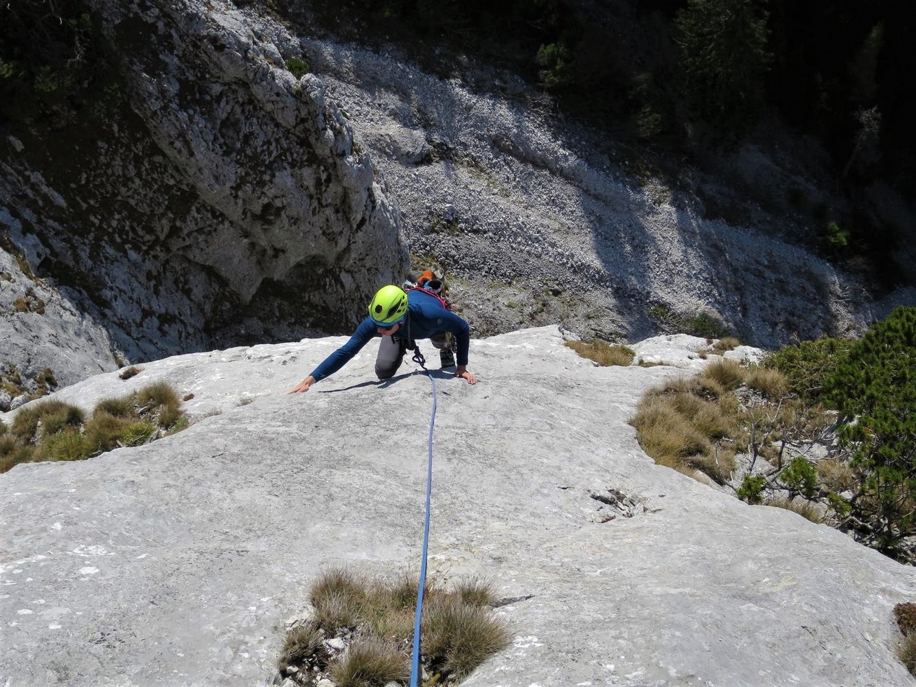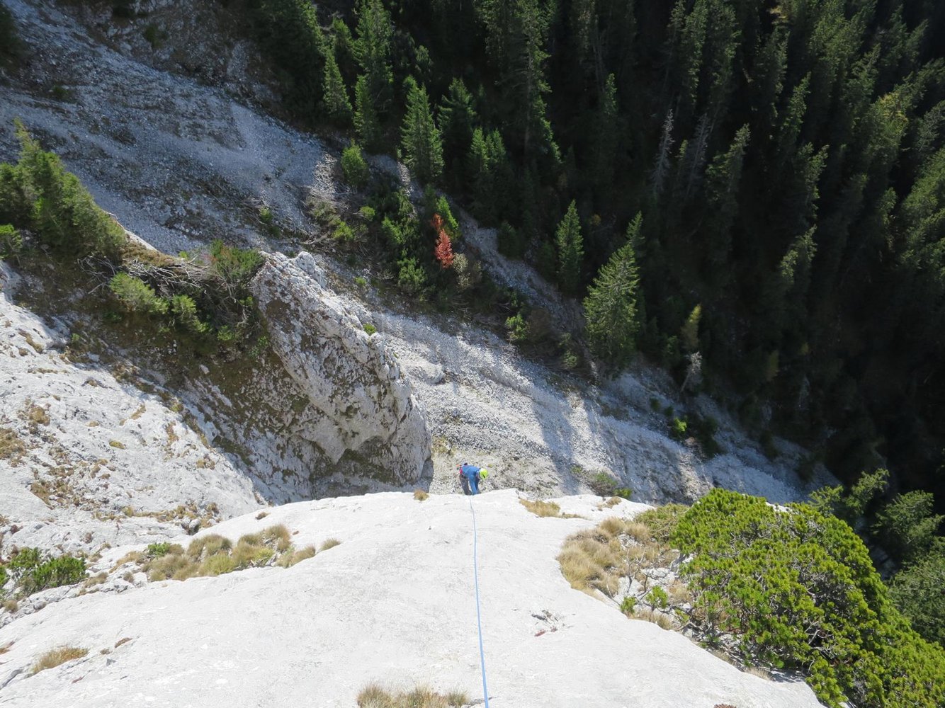 Kurze, aber großartige Tour, die sehr sportlich gesichert ist und schon relativ altes Material aufweist. Die ersten beiden Seillängen sind so lala, dann folgt aber allerbeste, steile Plattenkletterei! Für die 80 Meter, aber recht langer Zustieg!