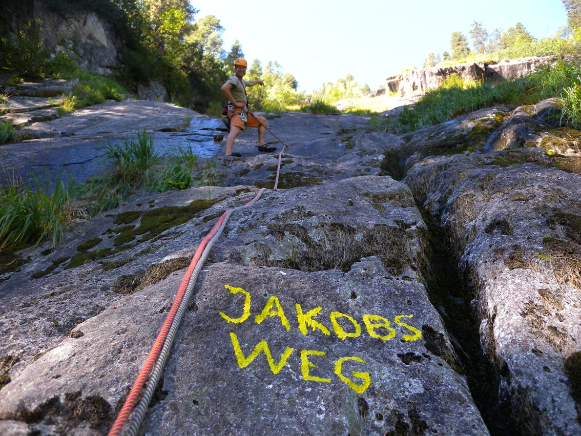 In der Tour findet man Plattenkletterei vom Feinsten, die nach oben hin schwerer wird. Der Jakobsweg verläuft unweit der Klausenalm entlang einer unscheinbaren Plattenwand, an der die Erstbegeher geschickt die mit Bohrhaken gut abgesicherte Route installiert haben. Auf die „Pilgerreise“ sollte man anstatt der Bibel eine Dschungelausrüstung mitnehmen - rustikaler Abstieg! Ohne gutes Schuhwerk und etwas alpiner (Garten-)Erfahrung kommt man nicht runter. Kaum zu glauben, dass man direkt neben der Tour einfach wieder runter geht. Gesamt ein kühnes Abenteuer, das man durchaus weiter empfehlen kann.