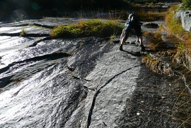 Nässe kann zum Problem werden - beim Klettern und beim Abstieg. Am besten eine längere Trockenperiode abwarten! Achtung: Der Abstieg ist heikel, alpine Erfahrung ist erforderlich!