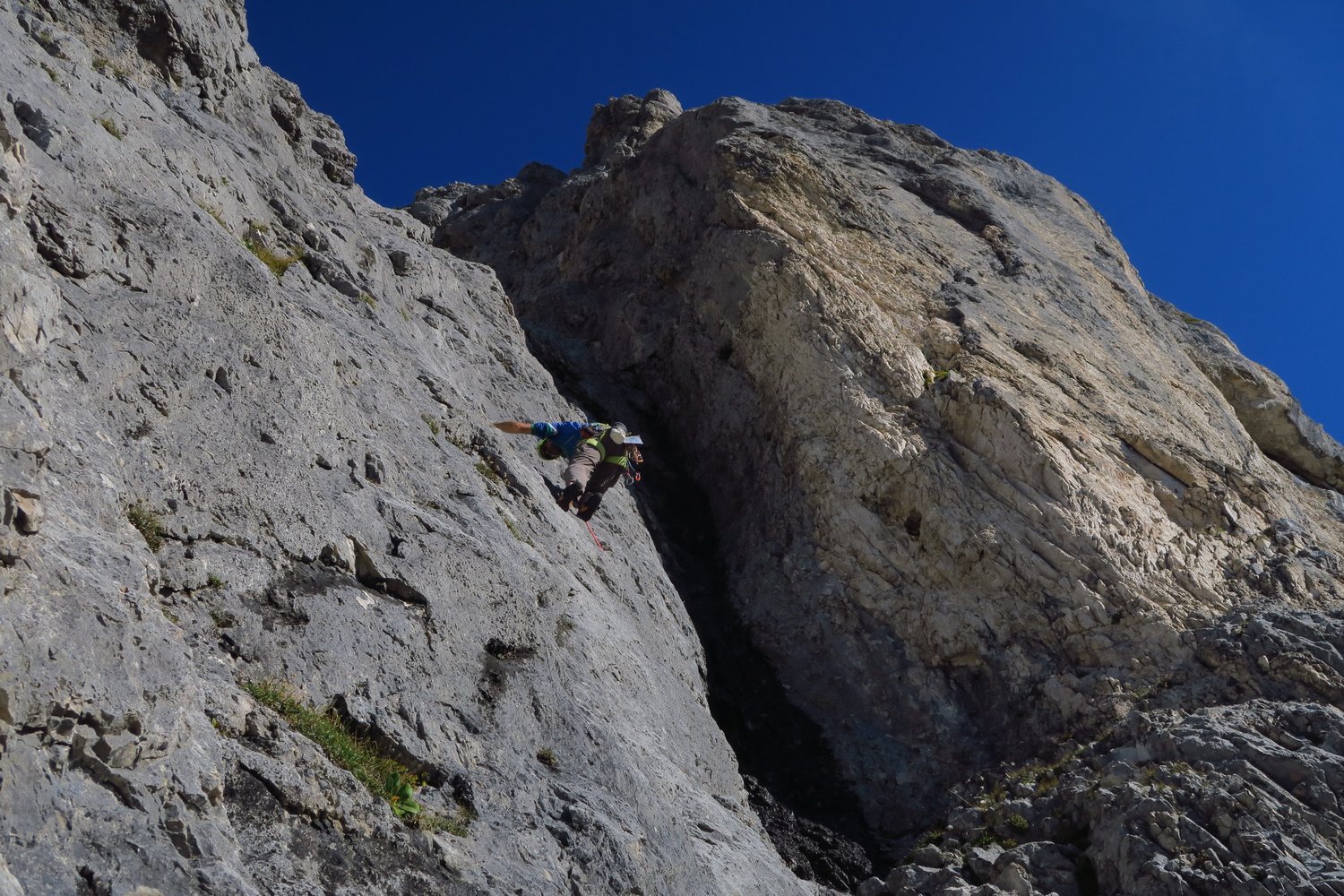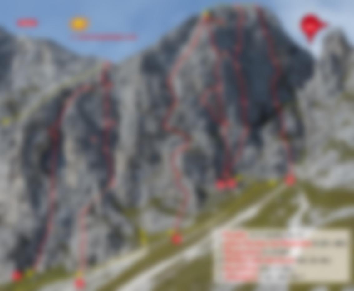 Achtung: In dieser Route wurden allem Anschein nach von Unbekannten einige Bohrhaken abgeflext! Im Sommer 2023 gab es in der zweiten Seillänge leider auch einen tödlichen Unfall. Laut diversen User-Kommentaren ist die Kletterei aber immer noch recht gut abgesichert (auch meinen erfahrenen Kletterer, welche diese Route kennen und diese auch gerade geklettert sind, dass überhaupt keine Bohrhaken fehlen. Stand Sommer 2023). Grundsätzlich gilt aber - wie in anderen Kletterrouten auch - wenn man keine Bohrhaken mehr findet und die Route nicht kennt, besser umkehren, als evtl. auf falschem Weg (evtl. lockeres Gestein) ohne Sicherung weiterzuklettern.