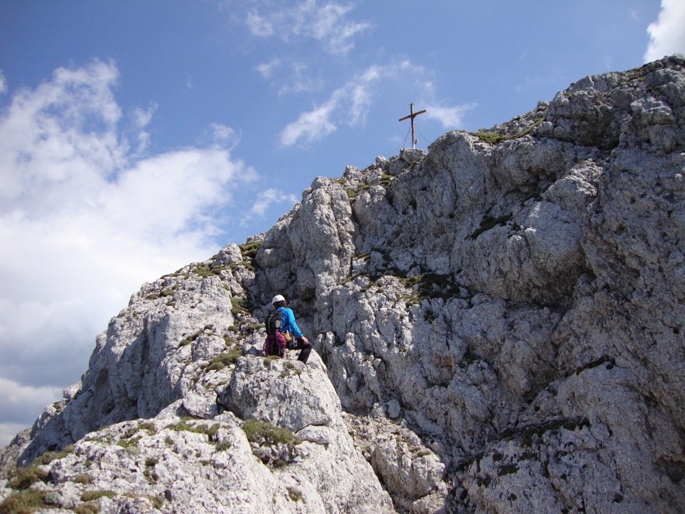 Vom Ausstieg 10m zum markierten Steig und auf diesem (5-10min) nach Westen absteigen bis zu einer Scharte. Einige Meter aufwärts zum Beginn des ÖTK- Klettersteigs bei einer blauen Tonne. Über den Klettersteig (B bzw. B/C) hinab und über das Schotterfeld zurück zum Einstieg. Weiterer Abstieg: wie Aufstieg.