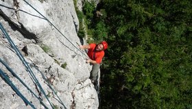 Neue, nette und sehr gut abgesicherte Plaisirtour von den Altmeistern Peter Königsberger und Alfred Riedl, die Peter zu seinem 70er geklettert ist. Die Linie ist etwas gesucht, bietet aber gemütliche Kletterei in durchwegs festen Fels.