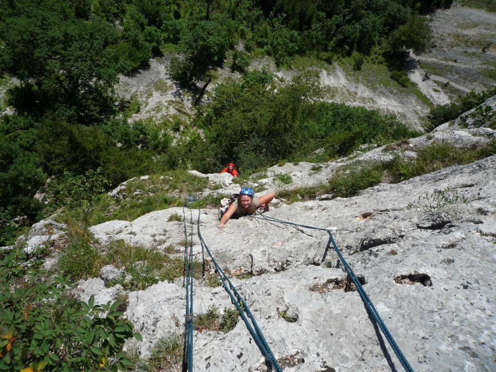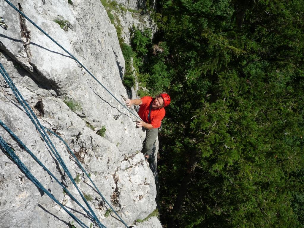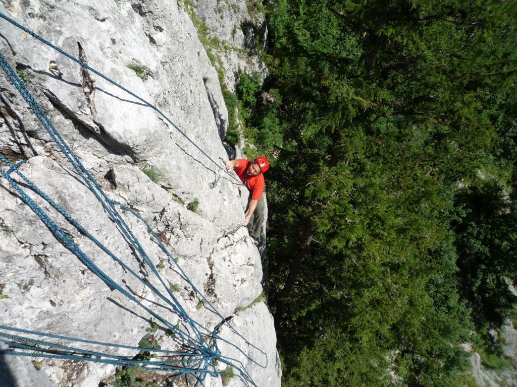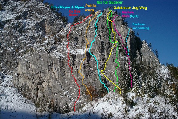 Neue, nette und sehr gut abgesicherte Plaisirtour von den Altmeistern Peter Königsberger und Alfred Riedl, die Peter zu seinem 70er geklettert ist. Die Linie ist etwas gesucht, bietet aber gemütliche Kletterei in durchwegs festen Fels.