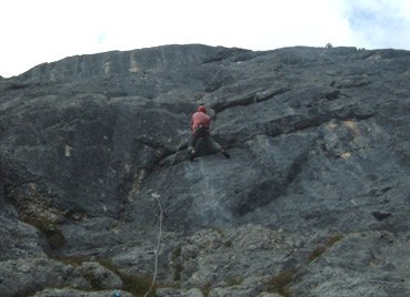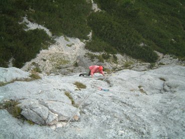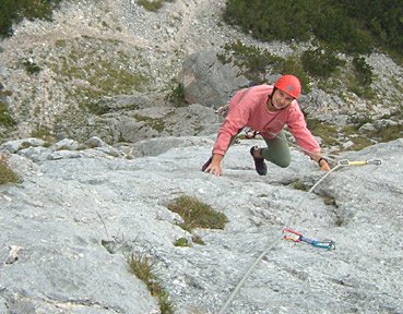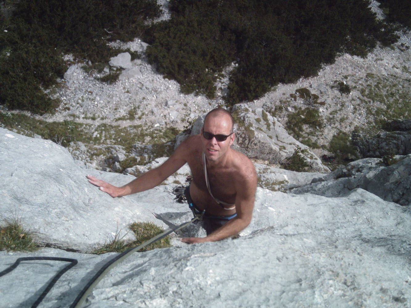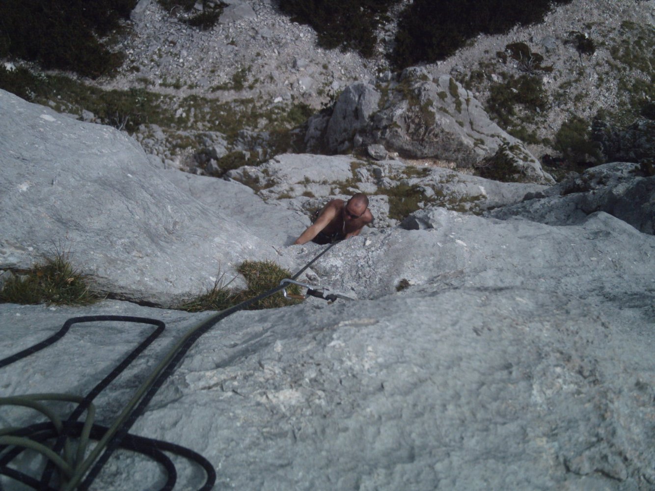 Eine der leichteren Routen am Klobenjoch. Im unteren Teil geht es an Schuppen und schönen Rissen aufwärts, kurze schwere Stelle am Beginn des Steilstückes (kann man aber auch gut A0 machen), danach kommt leichte und teils sehr orginelle Plattenkletterei. Die letzte Länge quert unter Überhängen nach rechts oben zum Abseilstand.