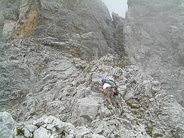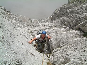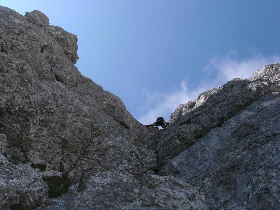 Diese sehr alpine Tour gehört zu den langen Kaisertouren (ca. 600 Hm), man findet alle Arten von Felsqualitäten vor. Der schrofige Vorbau leitet über eine Graspassage in den relativ festen und ausgewaschenen Fels im Mittelteil. In diesem Teil befinden sich auch die Hauptschwierigkeiten 5+ (kann auch 5-/A0 gemacht werden). Danach kommt ein sehr alpines und brüchiges Finale im 3ten Grad. Es handelt sich um eine "leichtere" Tour mit zwei kleineren Überhängen, die man auch technisch (A0) überwinden kann. In zwei Seillängen wird Klettern im 5. Schwierigkeitsgrad gefordert. Die große Wand mit der Route betrachtet man am besten von der Gruttenhütte aus. Die Hütte ist der günstigste Ausgangspunkt - es hängt dort auch ein Übersichtsfoto mit eingezeichneter Route auf (sicherheitshalber auch unseres ausdrucken).