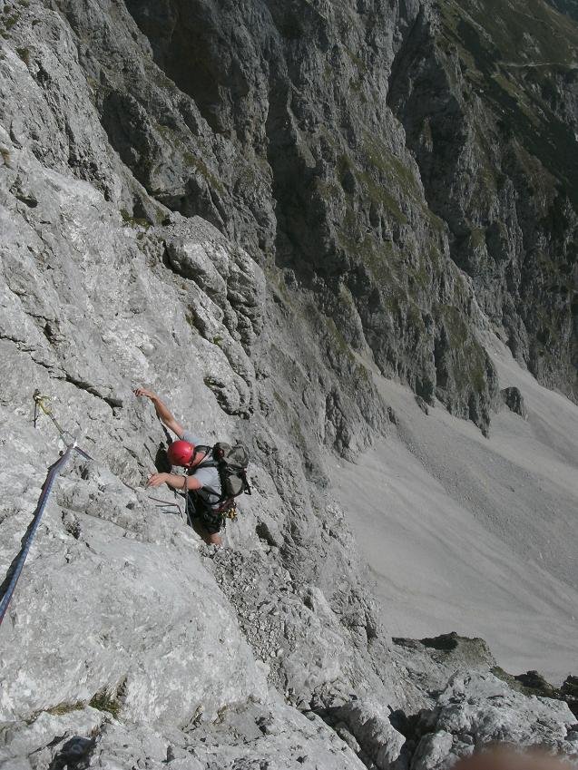 Achtung: Es gibt keinen Fluchtweg in Gipfelnähe des Ostpfeilers. Vorsicht bei unsicherer Wetterlage! Die gebohrten Standplätze ermöglichen jedoch bis zur 13. Seillänge einen halbwegs komfortablen Rückzug (mit Doppelseil).