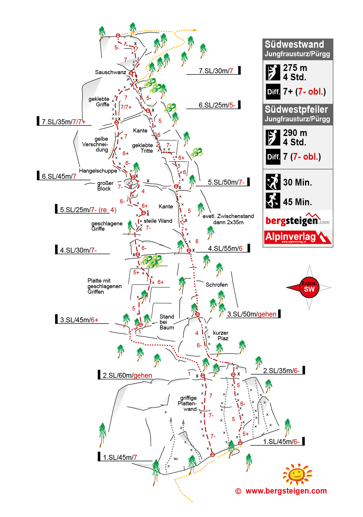Interessante Route links des klassischen Südwest (SW)-Pfeilers, die aber schwieriger und anspruchsvoller ist. Der Fels ist oft glatt. Das Gebiet liegt in einer "Jägerproblematischen-Zone", also bitte ruhig verhalten und wenn möglich bei Einbruch der Dämmerung wieder beim PKW sein.