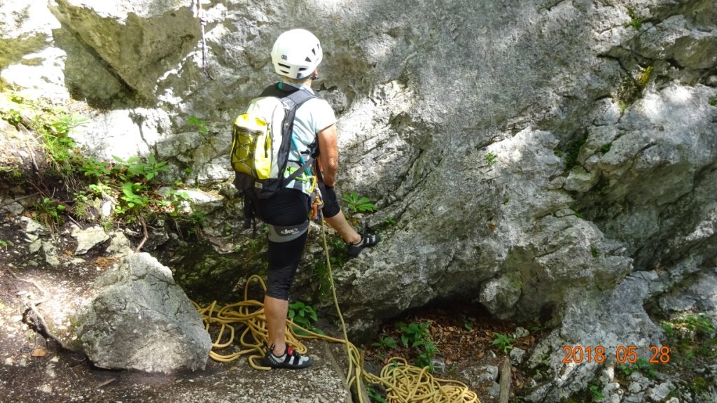 Vom Ausstieg den Steigspuren nach rechts Pfadspuren bis zum Wanderweg folgen. Auf diesem dann bergab und der Wand entlang bis man kurz vor dem Sattel zur Hangelschuppe (4; sehr empfehlenswerte Draufgabe!) kommt. Dort dann weiter auf dem Wanderweg zum Ausgangspunkt.