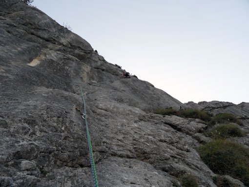 Die Route ist durchgehend mit Bohrhaken abgesichert. An den Ständen sind jeweils zwei Bohrhaken angebracht.