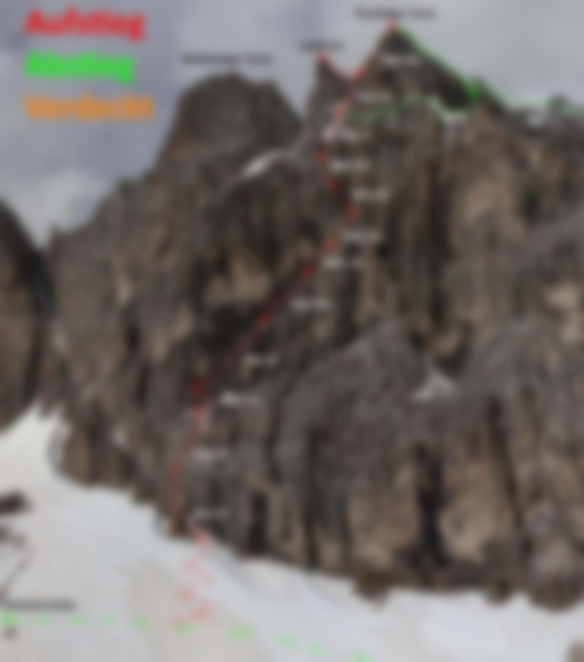 In der 6. SL (30m/IV) nicht wie auf der Originalroute die Rissverscheindung hinauf (Ausbruch und ca. 6+), sondern diese wie im Topo links durch die Platten umgehen!