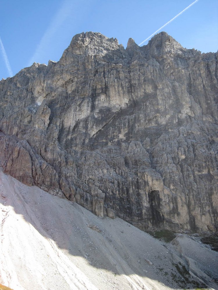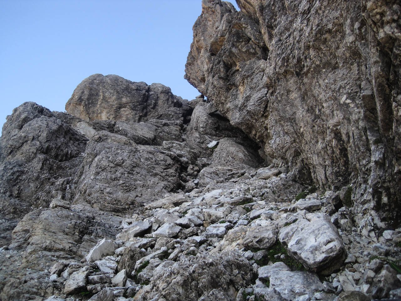 Abstieg kurz nach SO, über den 2. Kamin abseilen und über Schrofen in den Schuttkessel, dann Normalweg Tribulaun.