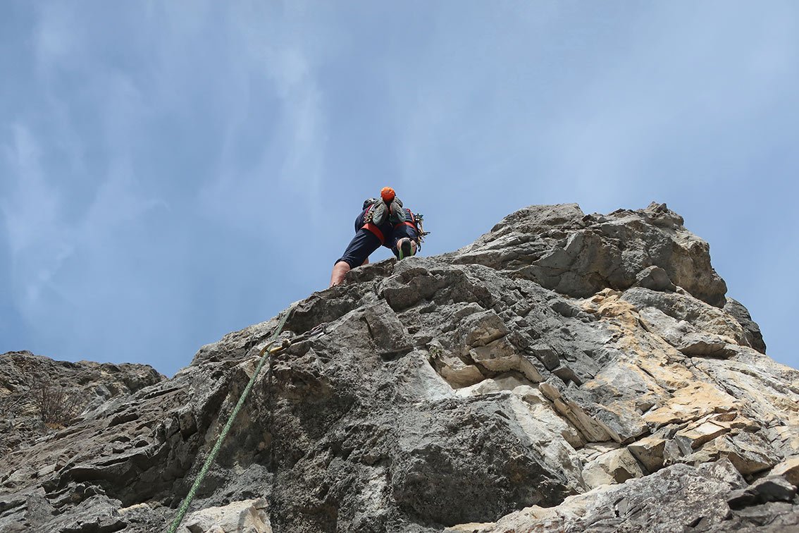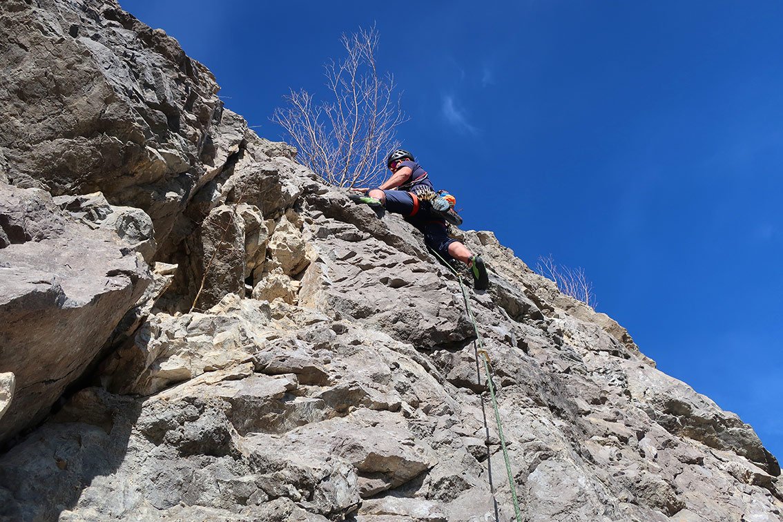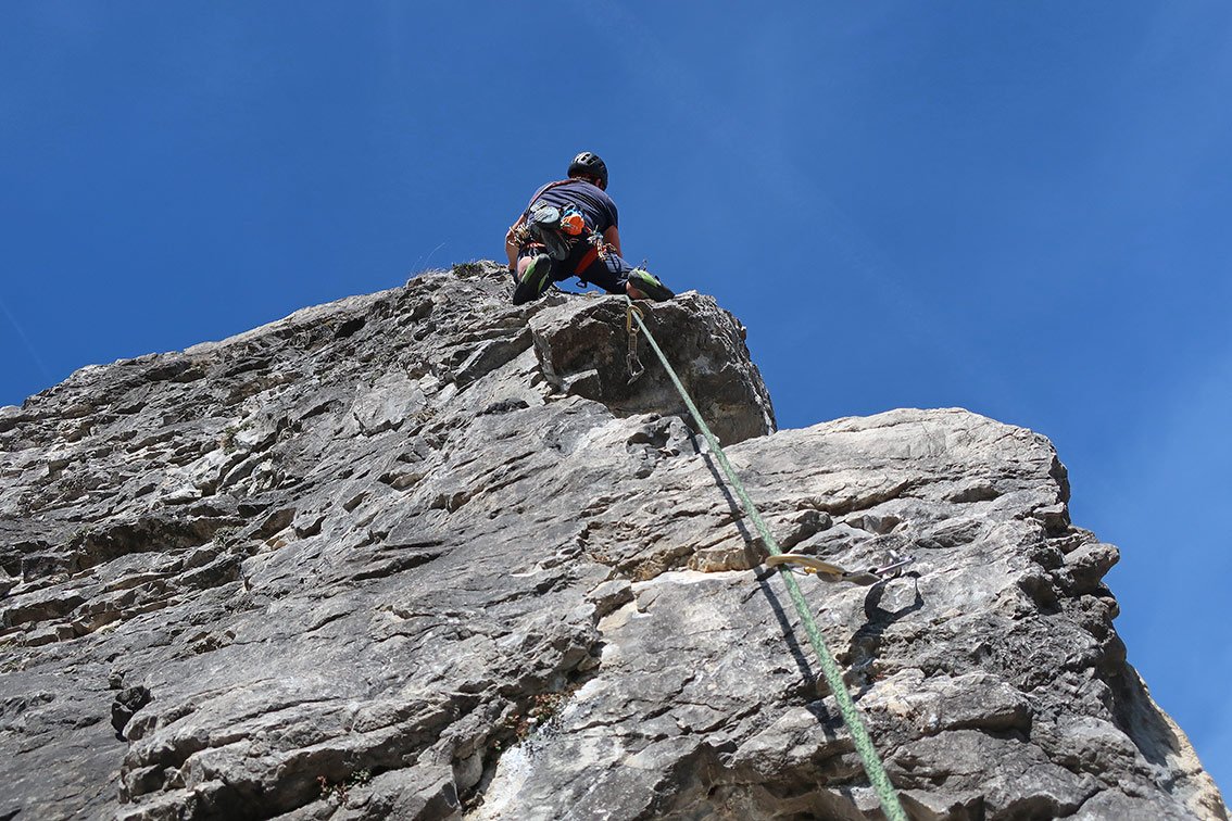 1 x 50 m Einfachseil, 12 Expressschlingen und vor allem einen Helm.