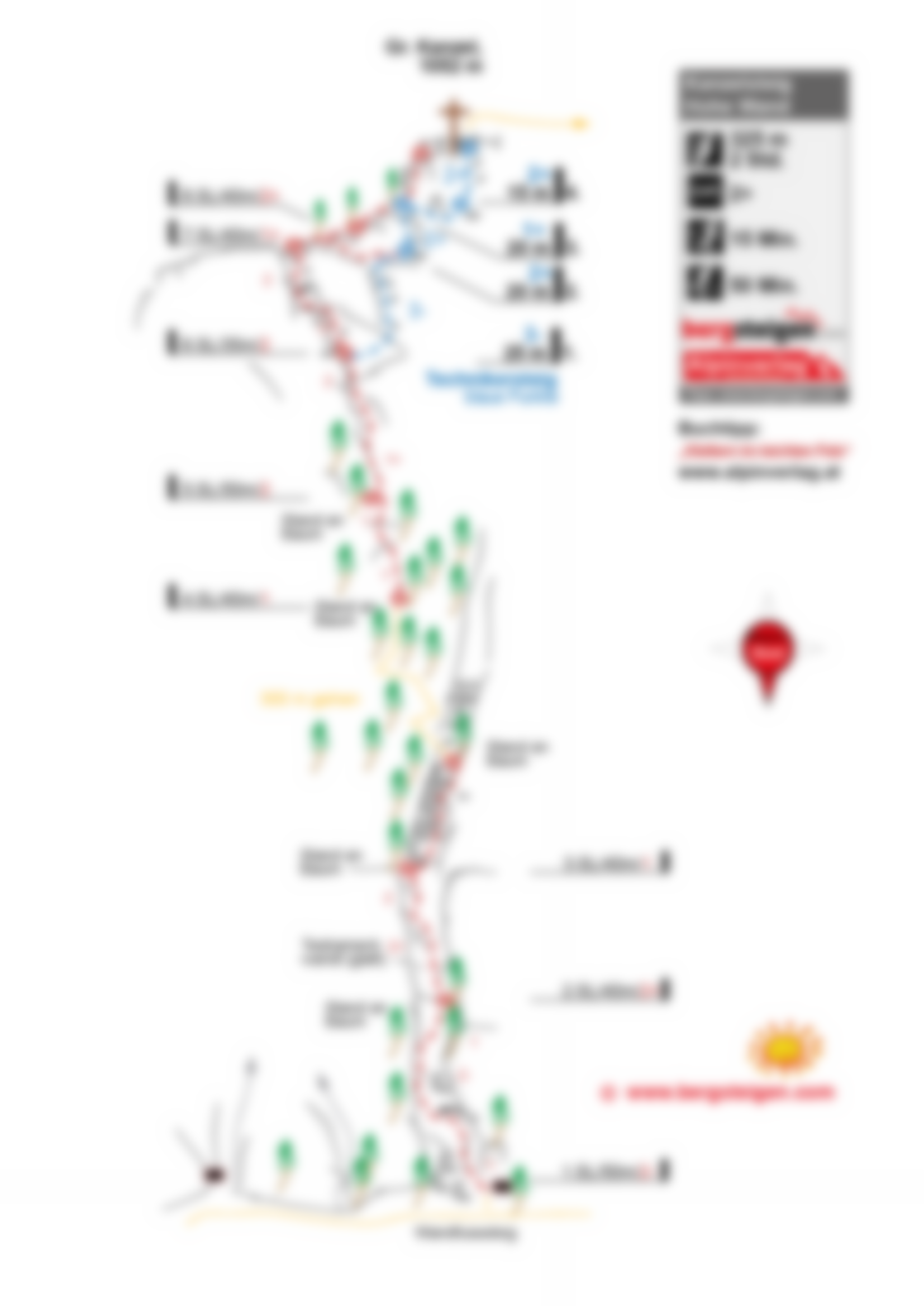 Siehe Topo. Der Steig ist durchgende mit gut sichtbaren roten Punkten markiert.