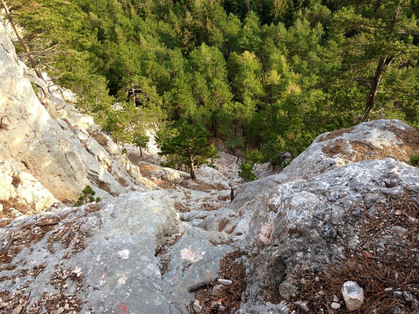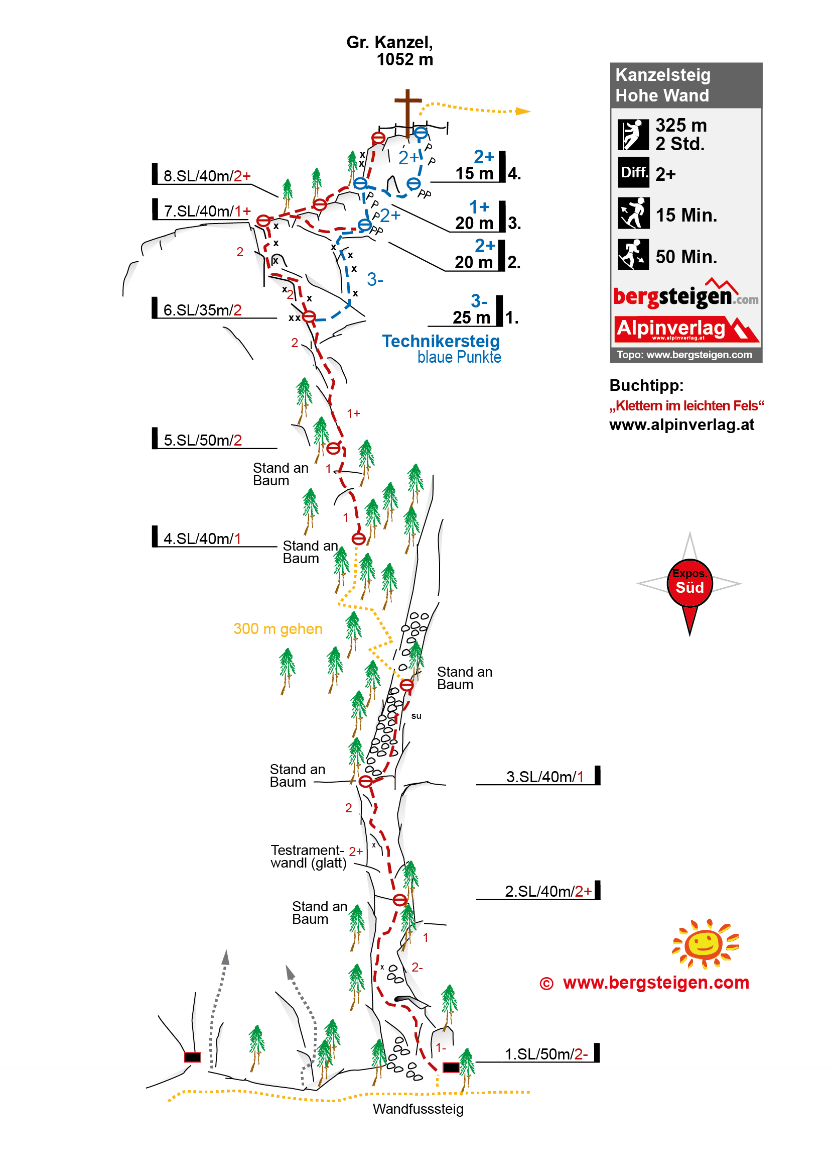 Ganz oben bietet sich der Ausstieg über den sanierten Technikersteig - vier kurze Seillängen bis 2 + - an. Siehe dazu Topo! Der Technikiersteig ist von der Schwierigkeit hier nicht schwieriger als der Kanzelsteig, aber wesentlich augsetzter!