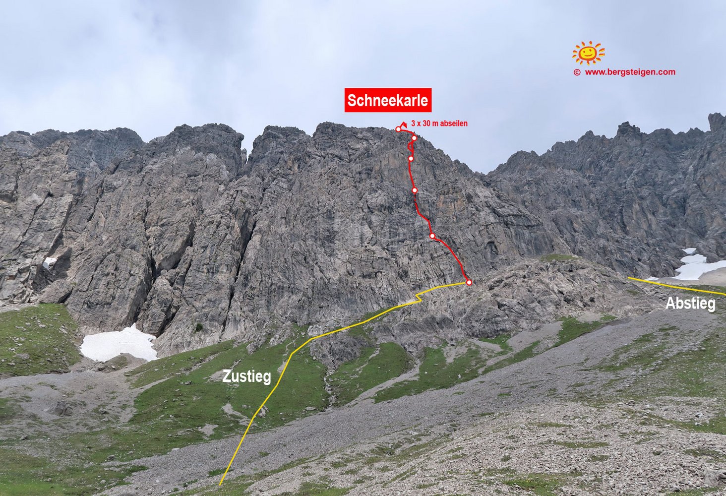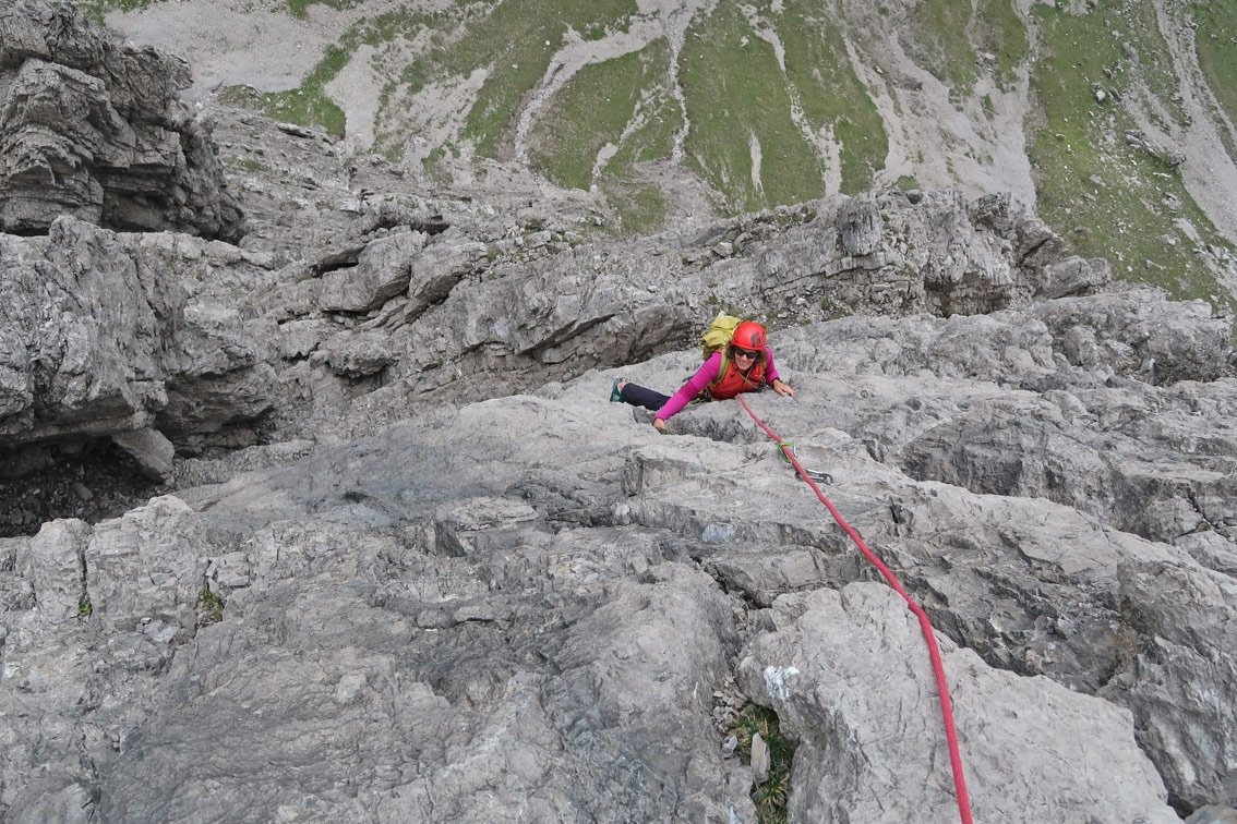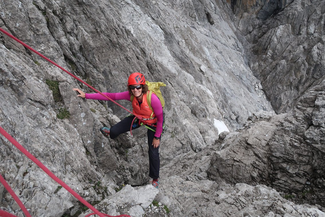 Vom Ende der Tour 3 x 30 Meter in das Schuttkar abseilen. Nach dem letzten Mal abseilen waagrecht nach rechts (in Richtung des schon sichtbaren markierten Weges) zum Fixseil und mit diesem zum Wanderweg. Über den Weg absteigen und unten auf dem Zustiegsweg zurück ins Tal.