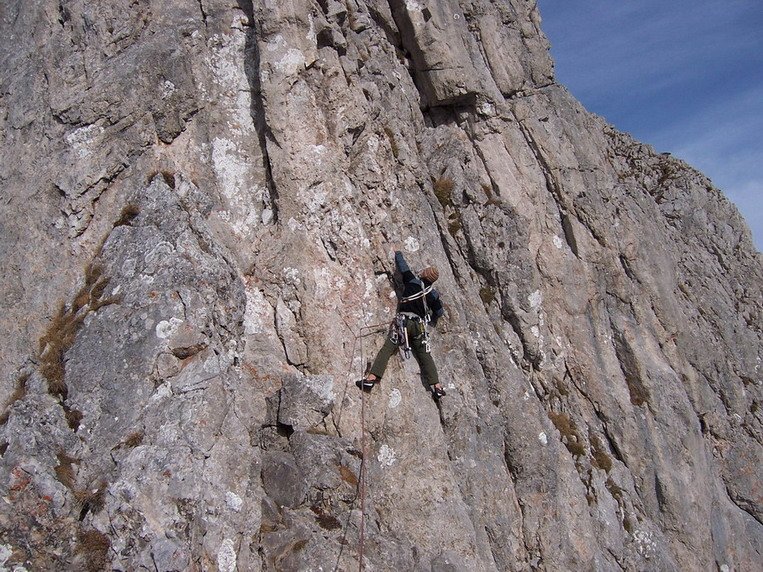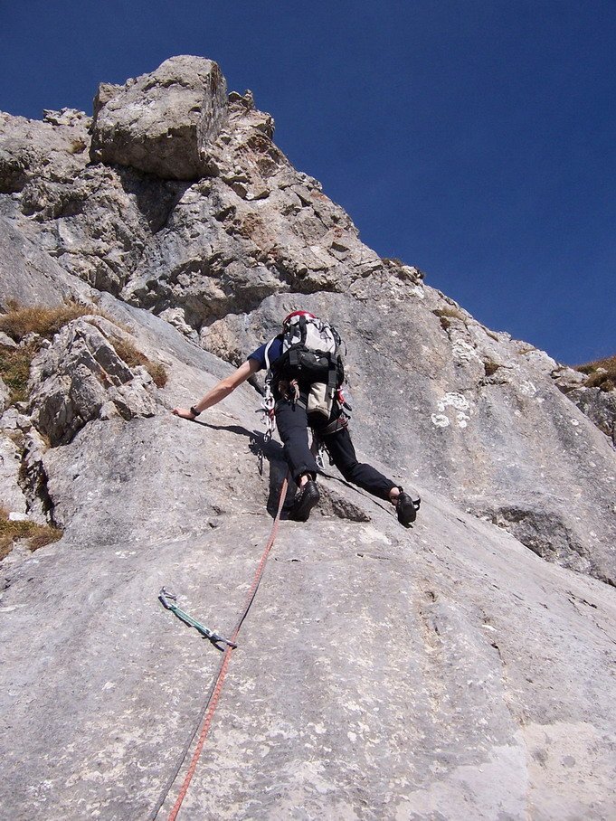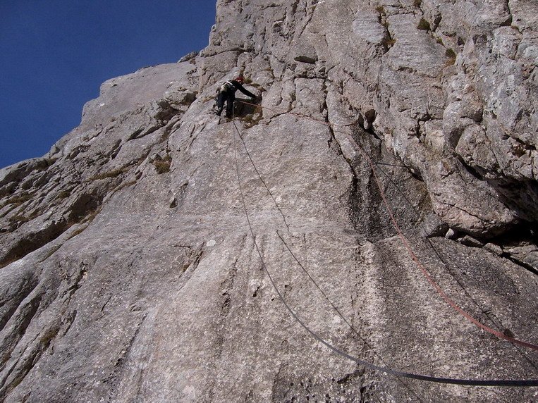 Lange, lohnende Kletterei, die trotz Sanierung einen sicheren Vorsteiger verlangt. Teilweise etwas brüchig und schrofig, trotzdem ein empfehlenswerter Klassiker. Ähnlicher Charakter wie der danbeben verlaufende Hauseggerpfeiler. Der heute übliche Einstieg verläuft über die ersten 4 SL. der "Schreiner/Obersteiner".