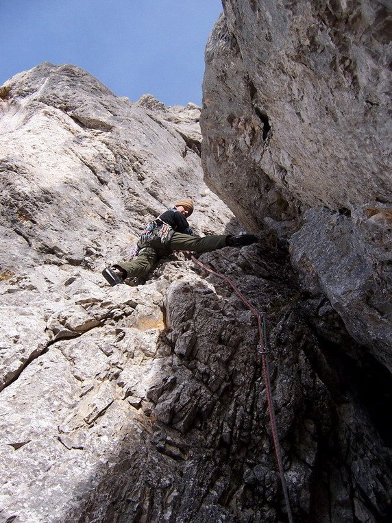 Anmerkung: Nach der 3. SL gibt es eine gute Variante (2 SL) über links. Keine Haken, daher zusätzlich einige Keile, u. Friends bis Cam 2.