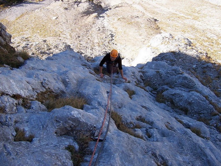 Vom Ausstieg (Bergrettungshaken) kurz absteigen dann durch eine Rinne auf einen Grasrücken I-II. Von dort entweder a) Durchs Stangenkar. Vom Grasrücken ostwärts schräg aufwärts und eine Rinne queren. Den Steinmännern und farbigen Markierungen folgend absteigen. Teilweise I und II. Trittsicherheit erforderlich! ca. 1 Stunde zum Einstieg.