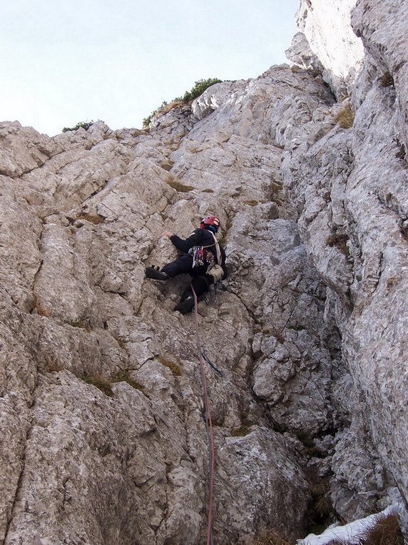 Variante b) Vom Grasrücken kurz nach SO zu einem Steinmann absteigen, einige Meter darunter befindet sich der erste Abseilstand (Bergrettungshaken). Von dort Abseilmöglichkeit. 2x abseilen zum Windspiel. Rest siehe Topo Windspiel. ca. 1 Stunde, 2x50m Nur für Erfahrene!