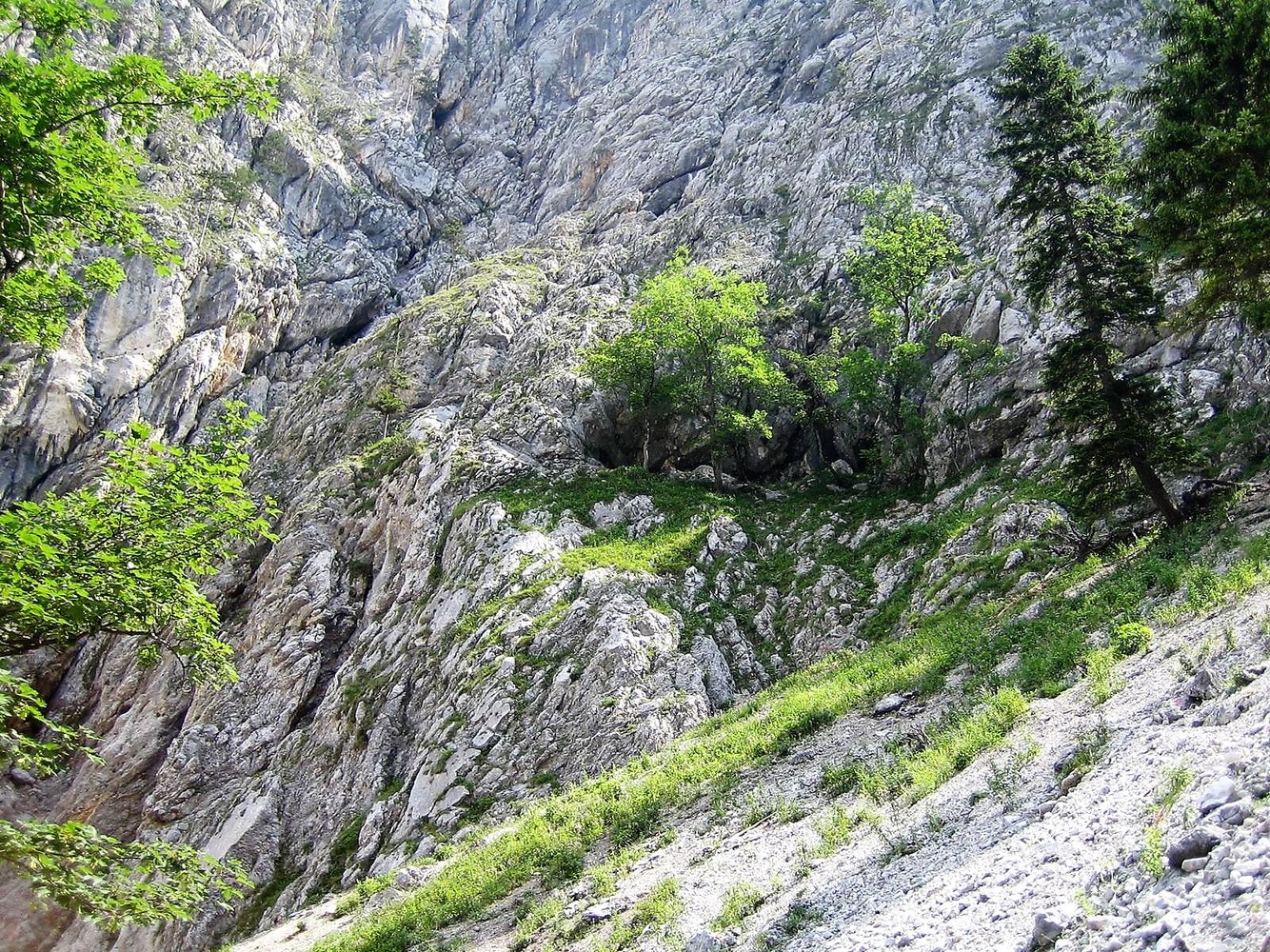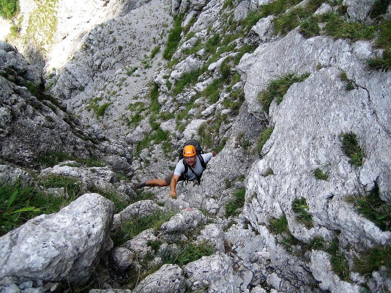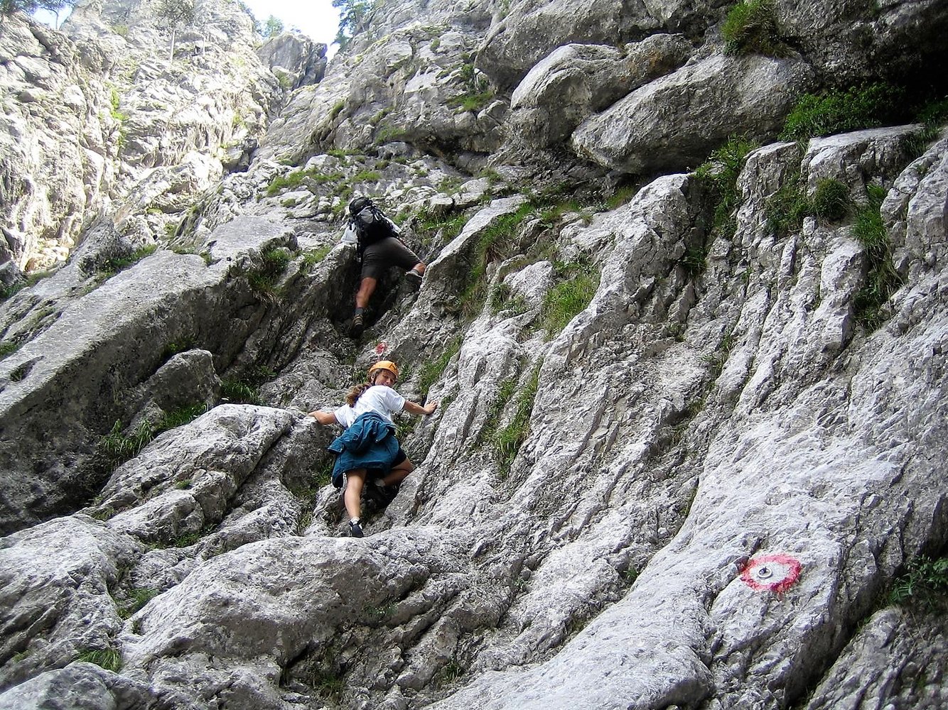 Ein Rax-Klassiker in dieser Schwierigkeit. Die Route führt anfangs durch eine Rinne und quert dann oben nach links in die Wand. Kurz vor dem Ausstieg wartet noch das Lach-kabinett, ein enger Durchschlupf. Eingesamt trotz etwas Schotter und einigen brüchigen Stellen lohnen. Die gesamte Route und der Einstieg sind rot markiert.