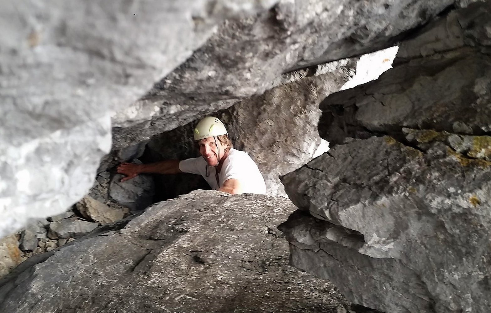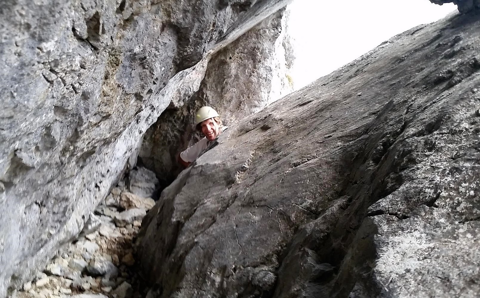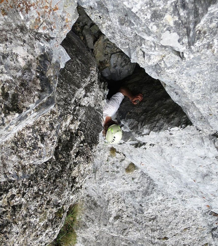 Ein Rax-Klassiker in dieser Schwierigkeit. Die Route führt anfangs durch eine Rinne und quert dann oben nach links in die Wand. Kurz vor dem Ausstieg wartet noch das Lach-kabinett, ein enger Durchschlupf. Eingesamt trotz etwas Schotter und einigen brüchigen Stellen lohnen. Die gesamte Route und der Einstieg sind rot markiert.