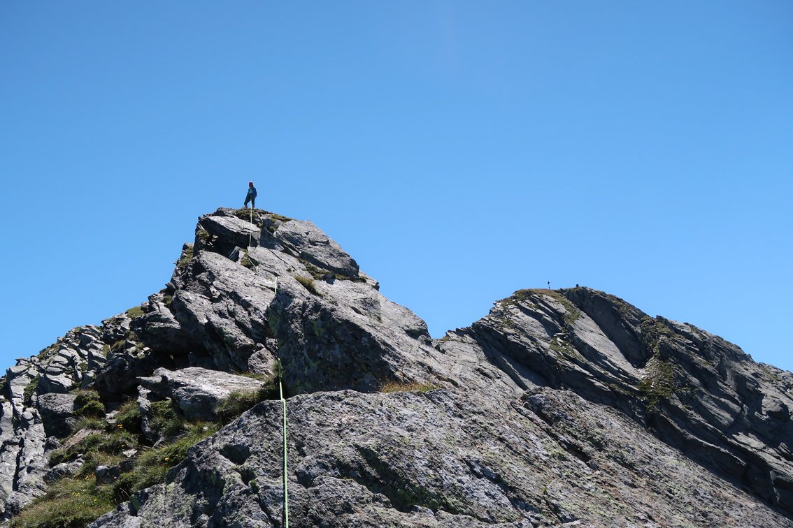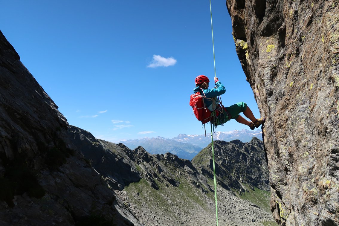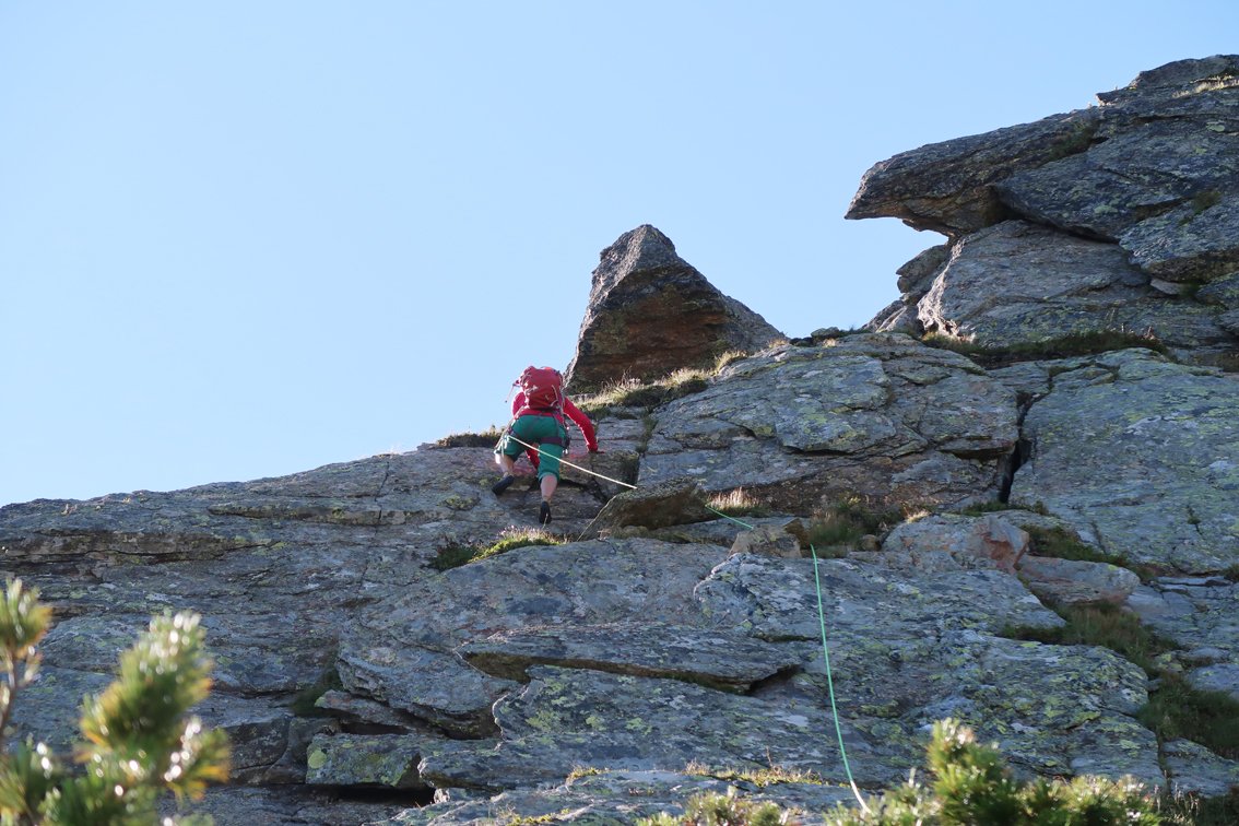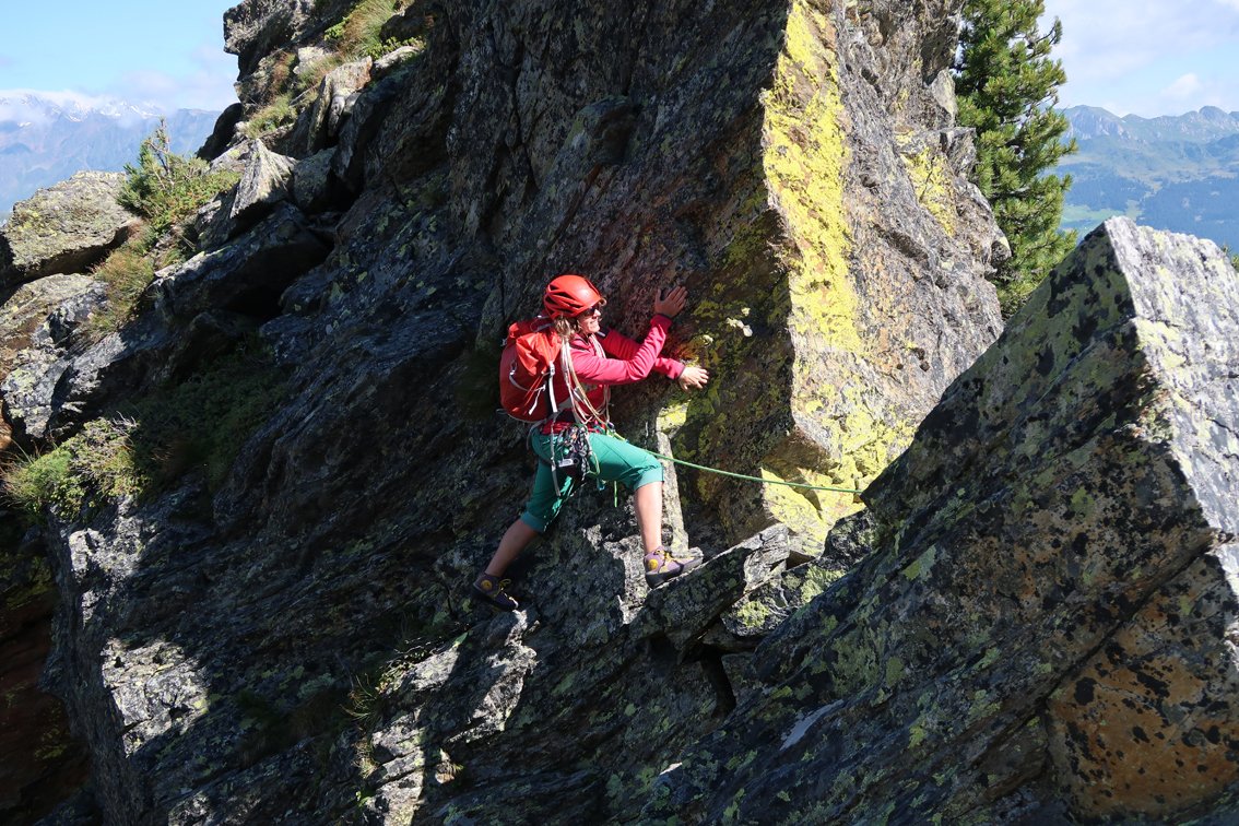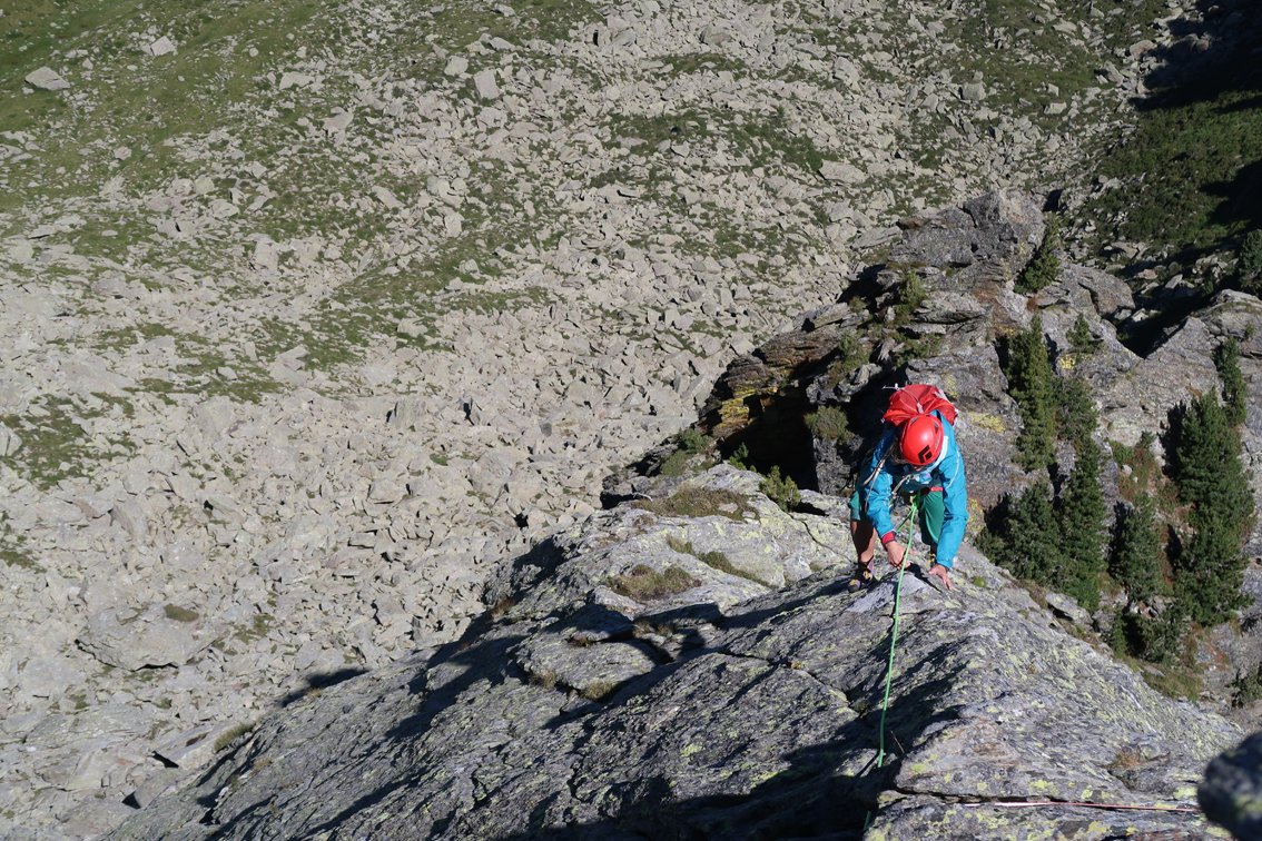 Alpine Klettertour - der Umgang mit mobilen Sicherungsmittel und etwas Gespür für die richtige Route sind gefragt. Der Vorsteiger sollte den 3ten Grad recht solide klettern und etwas alpine Erfahrung haben! Um schneller zu sein könnte man im mittleren und oberen Teil seilfrei oder am kurzen Seil klettern, das hängt aber von der Verfassung und dem Können der Begeher ab. Bei Nässe ist das Urgestein sehr rutschig und der Abstiegsweg gefährlich! Im Frühsommer oft länger Schnee - am besten man kommt im Hochsommer oder September.