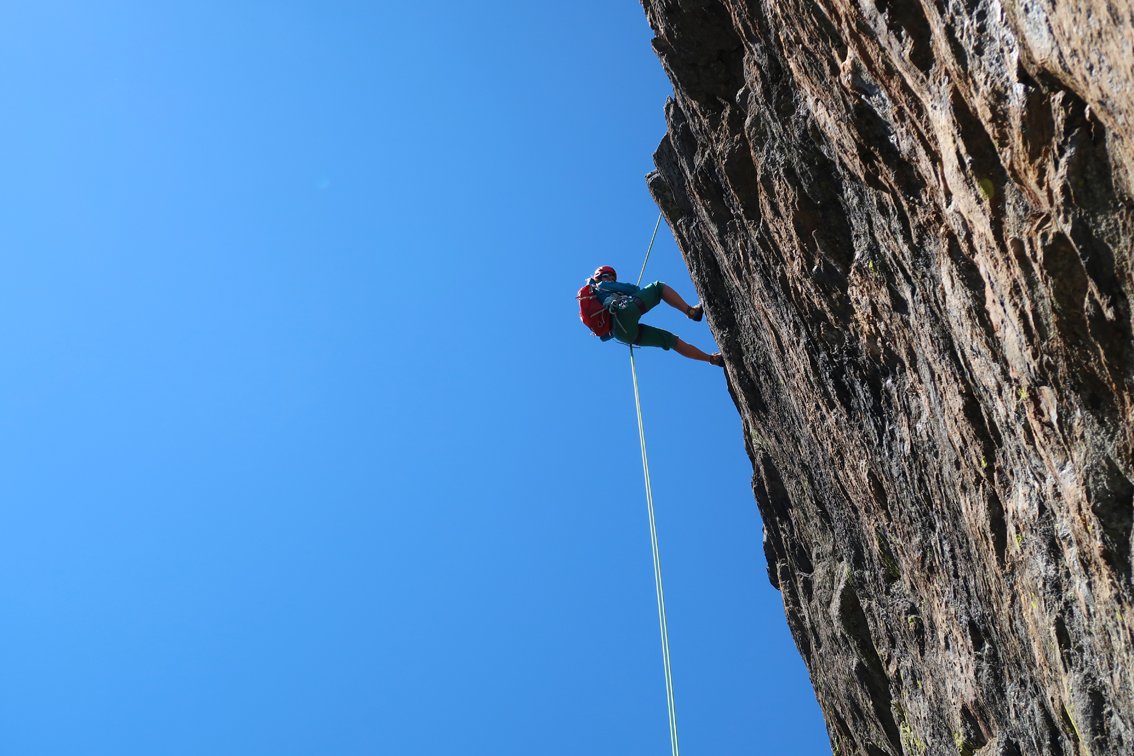 1 x 60 m Einfachseil, Klemmkeile und Friends, einige Bandschlingen (lange!) und Helm.