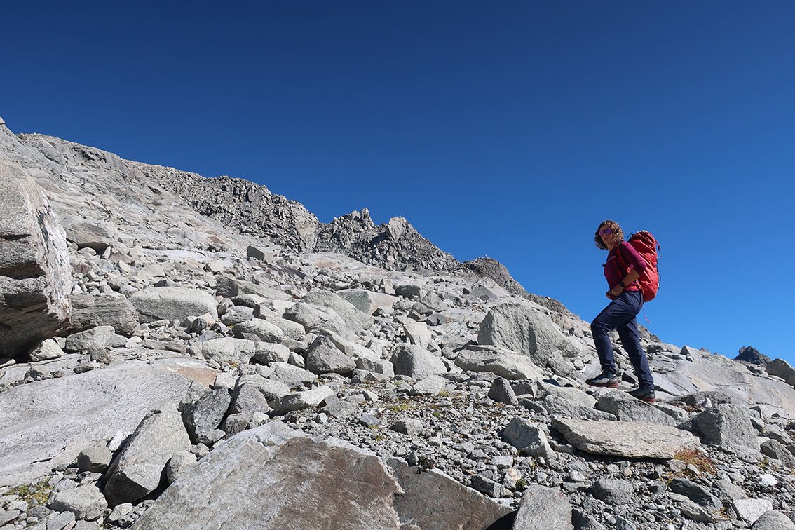 Vom Gipfel südwestliche auf dem markierten Bergweg absteigen, anfangs Blockgelände, dort wo das Gelände steiler wird, beginnt eine längere Stahlseilpassage, welcher man hinunter zu einem flachen Blockgrat folgt. Auf dem Blockgrat nach Westen, am Ende wieder steiler hinunter in das Blockgelände (auf die Markierungen achten). Man kommt wieder zur Abzweigung auf 2850 m und folgt dem schon bekannten Weg hinunter zur Kürsinger Hütte.
