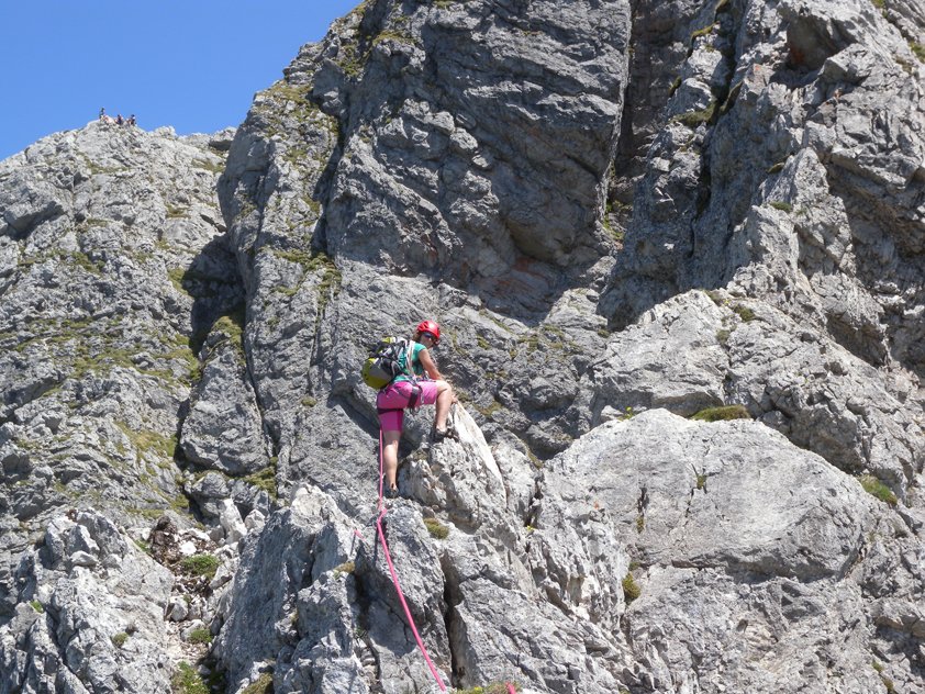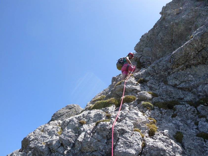 Vom Ausstieg auf dem Grat zum Hauptgipfel und auf dem Normalweg zurück zur Hütte und hinunter ins Tal.