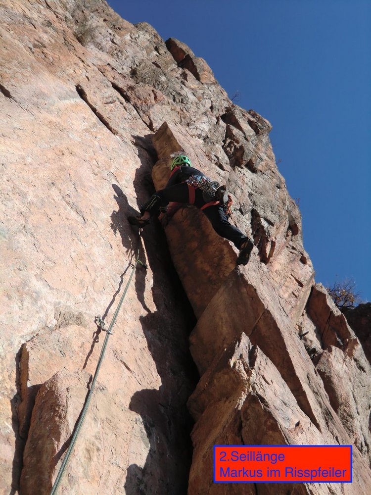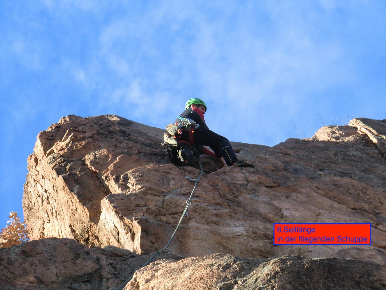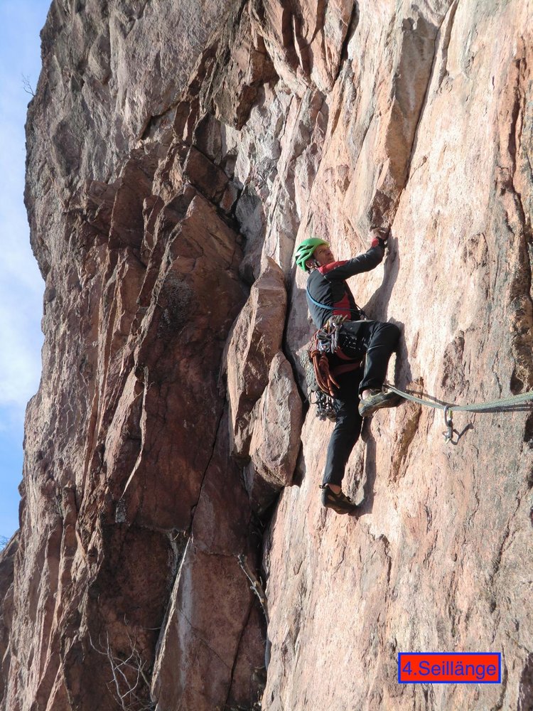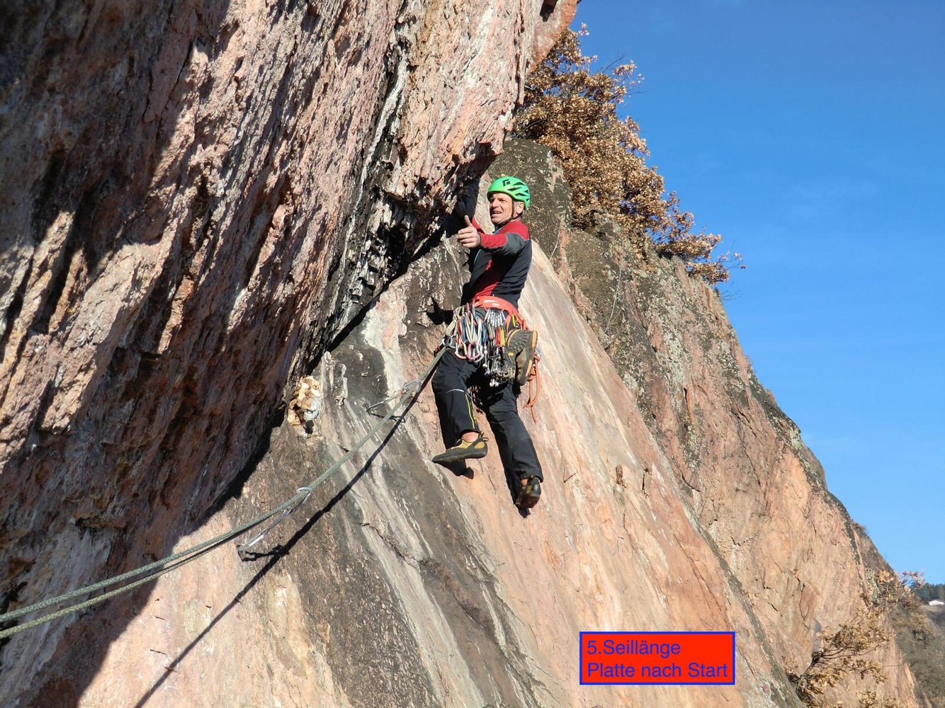 Schöne und sehr abwechslungsreiche Kletterei im orange/braun gebrannten Phorpyhrgestein. In den Seillängen ist alles zu haben, vom Piazriss, Platte, Überhang und Risse.