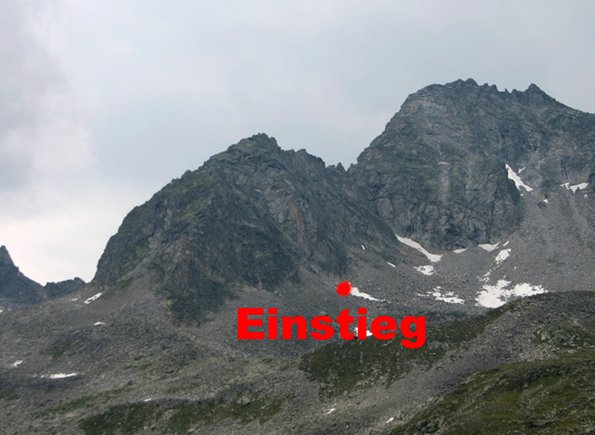 Von der Gießener Hütte (dorthin in etwa 1,5 Stunden) ca. 40 Min. Richtung Mallnitzer Scharte, bis auf eine Höhe von 2500 m, dann rechts Richtung Thomaslacke. Einstieg: Wandfuß ca. 2650 m auf großem Schneefeld (1 Stunde von der Gießener Hütte).