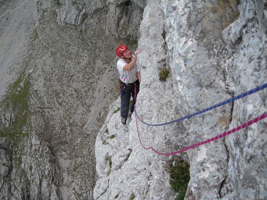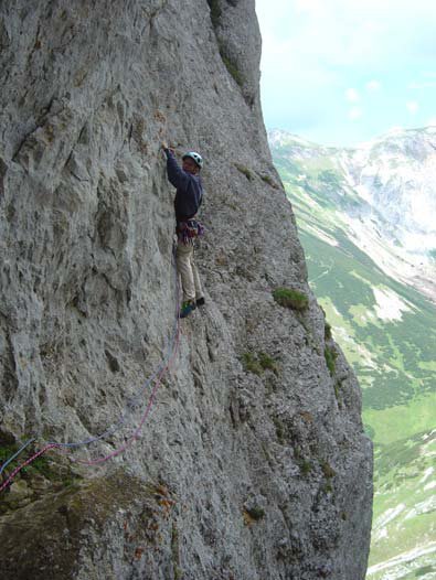 Der Einstieg befindet sich li. oberhalb einer riesigen höhlenartigen Nische bei einer kleinen Nische mit roter Erde – Bühlerhaken. Die Tour beginnt mit einer ausgesetzten Querung nach re. an gut griffiger Wand (der 1. H. ist etwas versteckt) und führt über einen Riss zu schmalem Band (35 m, 5 bis 6-). Nun steil li. hinauf zu der Rissverschneidung. Durch diese, an dessen Ende befindet sich die Schlüsselstelle, und dann re. über plattigen Fels zu Stand (30 m, 5- a0 oder 6 wenn frei). Jetzt waagerecht nach re. um eine Kante, ein wenig runter und wieder rauf zu einem großen Köpfl. Dahinter hinab zu Stand (30 m, 5- / 3, Seilreibung!). Vom Stand den weißen Riss empor und an einer Schuppe li. ansteigend, später eine Rampe nutzend zu luftigen Stand an der Pfeilerkante (25 m, 5- / 3). Von hier 3 SL re. der Pfeilerkante empor auf gr. Absatz (105 m, 3 bis 4+). ACHTUNG: Das kleine Band nach re. nicht verpassen – li. vielleicht in Summe weniger schwierig, jedoch keine Haken und kaum gute Risse zum Legen von Klemmkeilen. Es empfiehlt sich den von Türmchen und Absetzen gegliederten letzten Abschnitt in 2 SL zu bewältigen. Im Zweifelsfall eher re. haltend zur Gipfelwiese ansteigen.