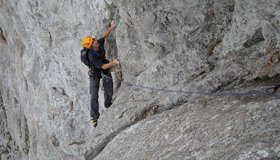 7 Express-Schlingen, mind. eine lange und mehrere kurze dünne Bandschlingen, bei Bedarf Klemmkeil Grundsortiment, Einfachseil, Doppelseil ist bequemer.