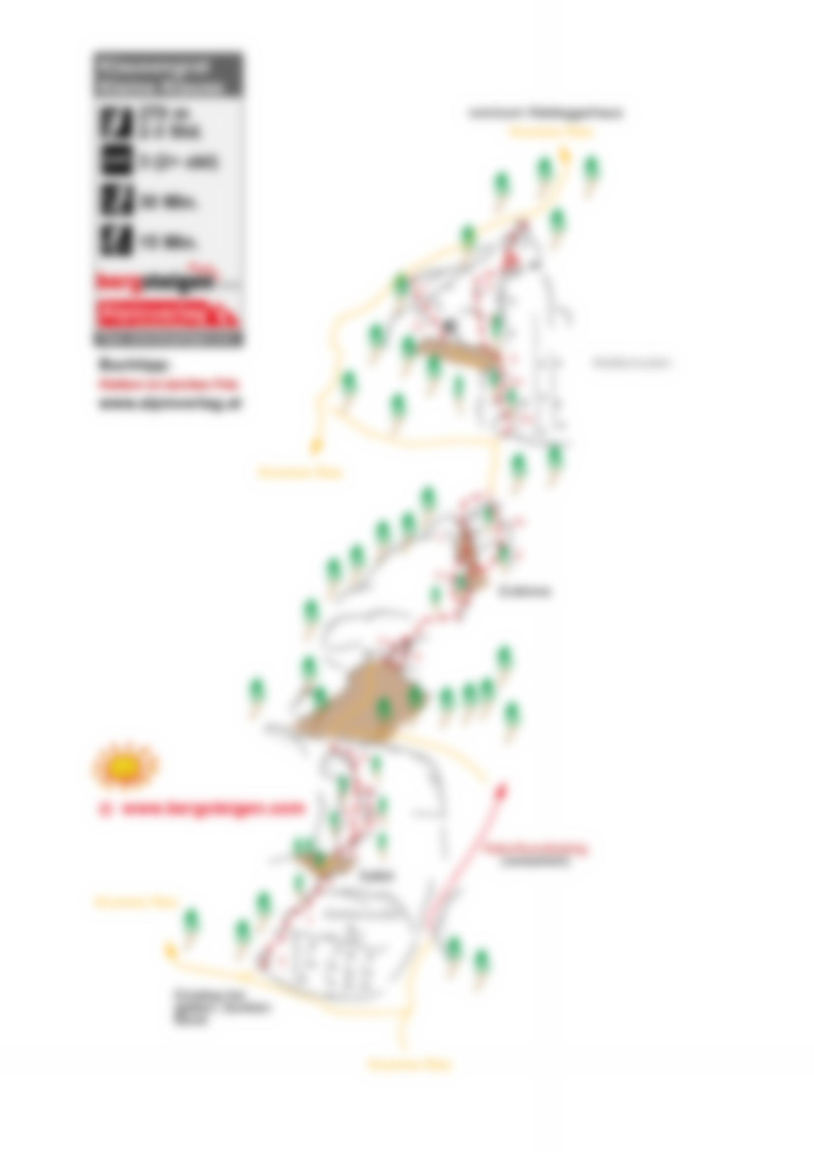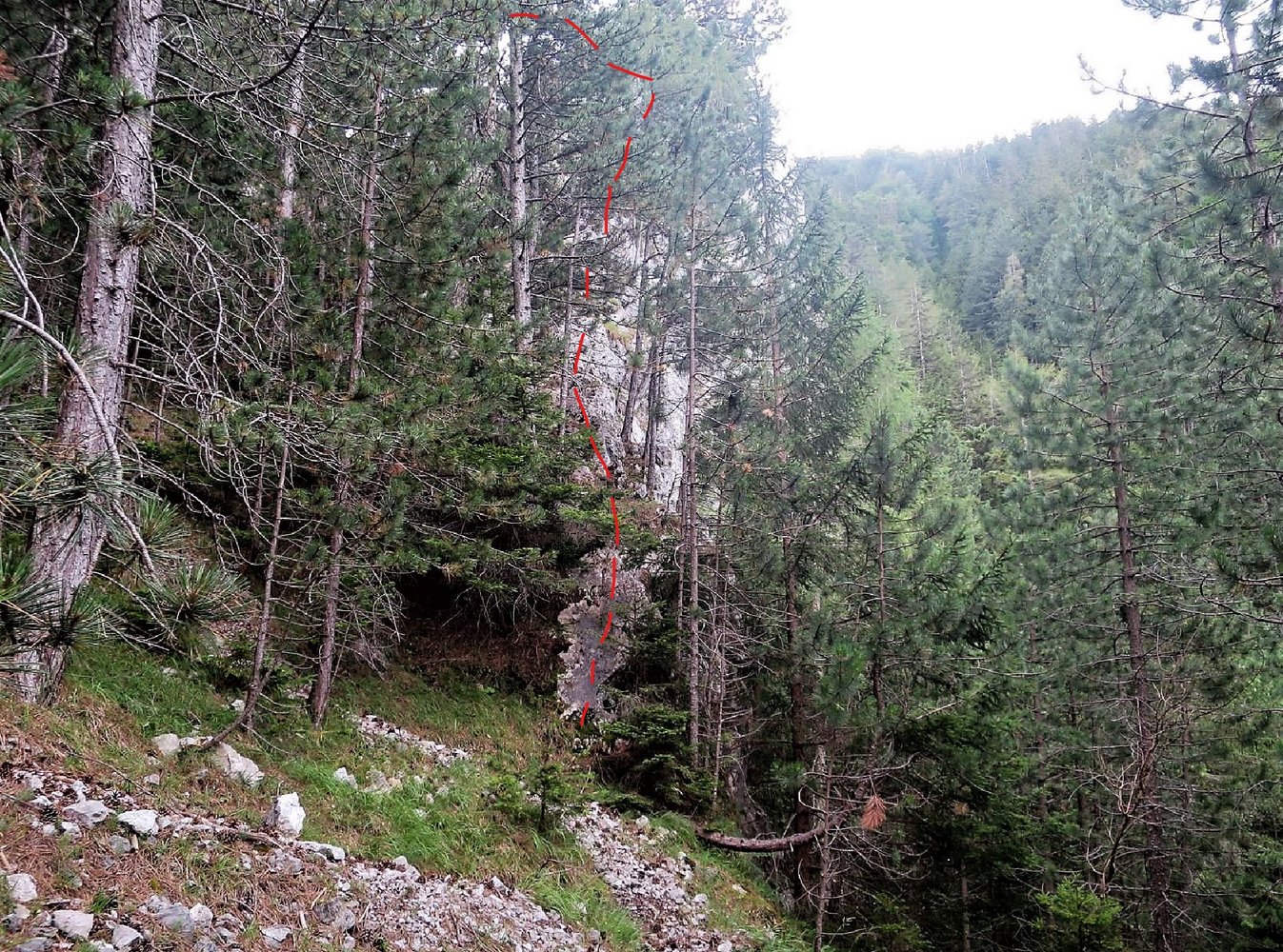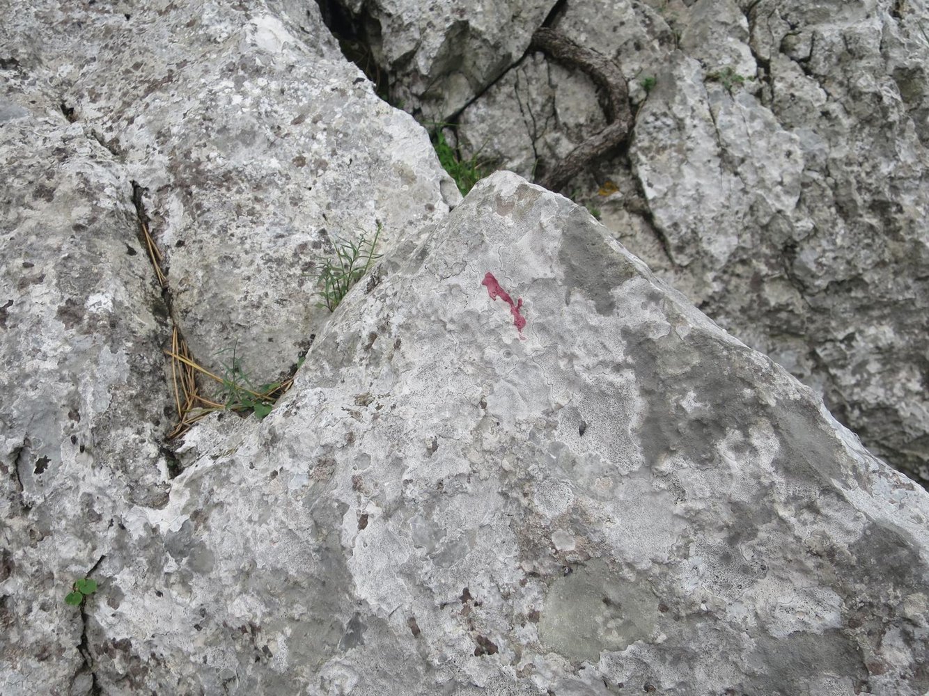 Die Route ist mit schwachen roten Strichen markiert, die aber nicht leicht zu erkennen sind.