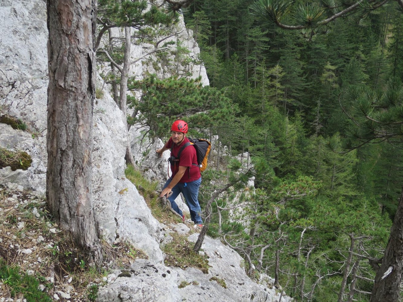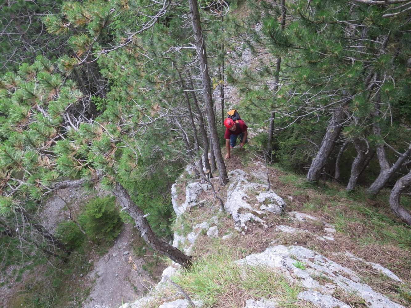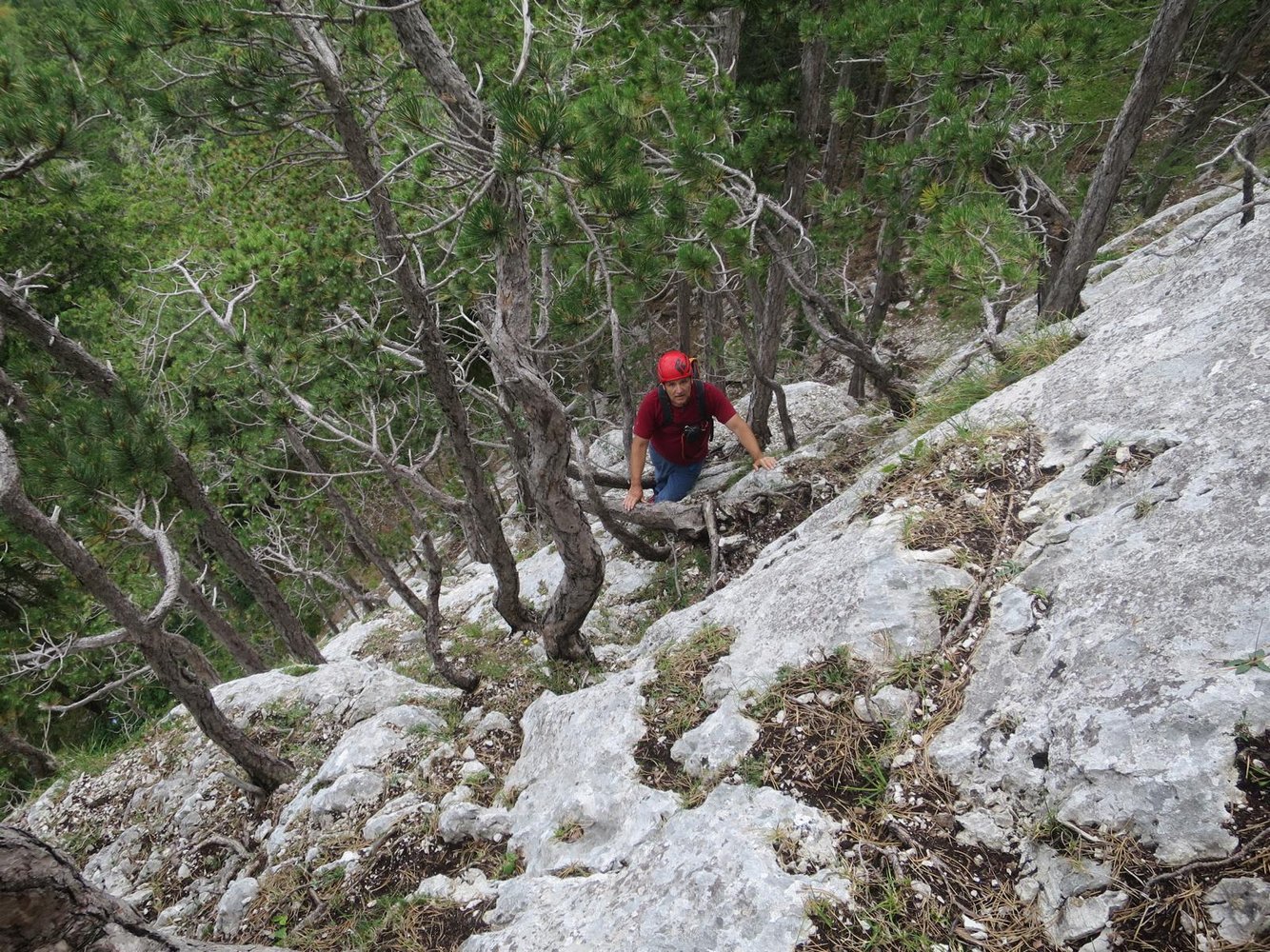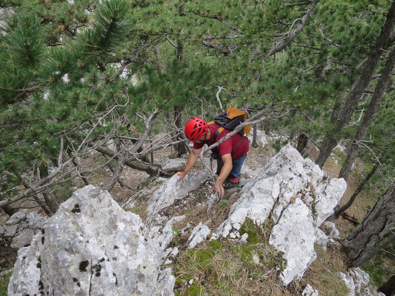 Keine Haken vorhanden, man kann aber sehr gut an den vielen Baumen mit Bandschlingen sichern.