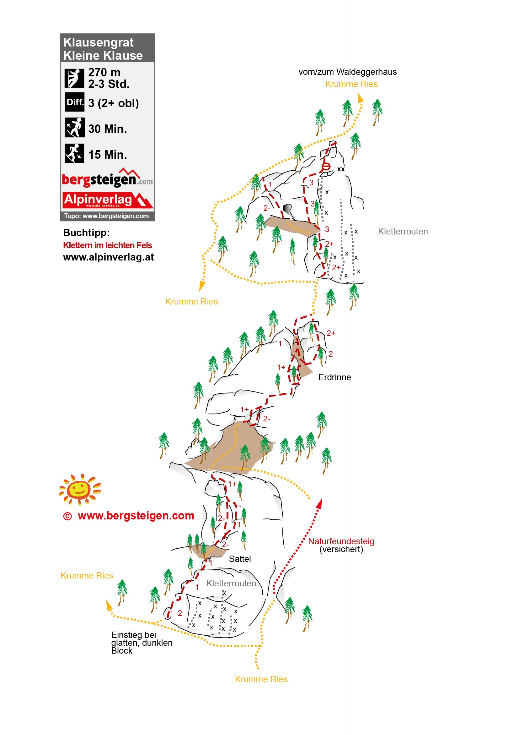Vom Wanderparkplatz unter dem Waldeggerhaus zu diesem Aufsteigen und über die grün/weiß markierte Krumme Ries Richtung Dürnbach absteigen, bis diese auf ca. 780 m Seehöhe markant wagrecht nach links führt (nach einer Wegkreuzung ohne Tafel). Die Krumme Ries führt direkt am Einstieg vorbei. Rechts bzw. nach dem Einstiegsgrat ist eine überhängende Wand mit schwierigen eingebohrten Kletterrouten. Auf der Einstiegsplatte ist ein schwach ausgeprägter roter Strich. Siehe Bilder!