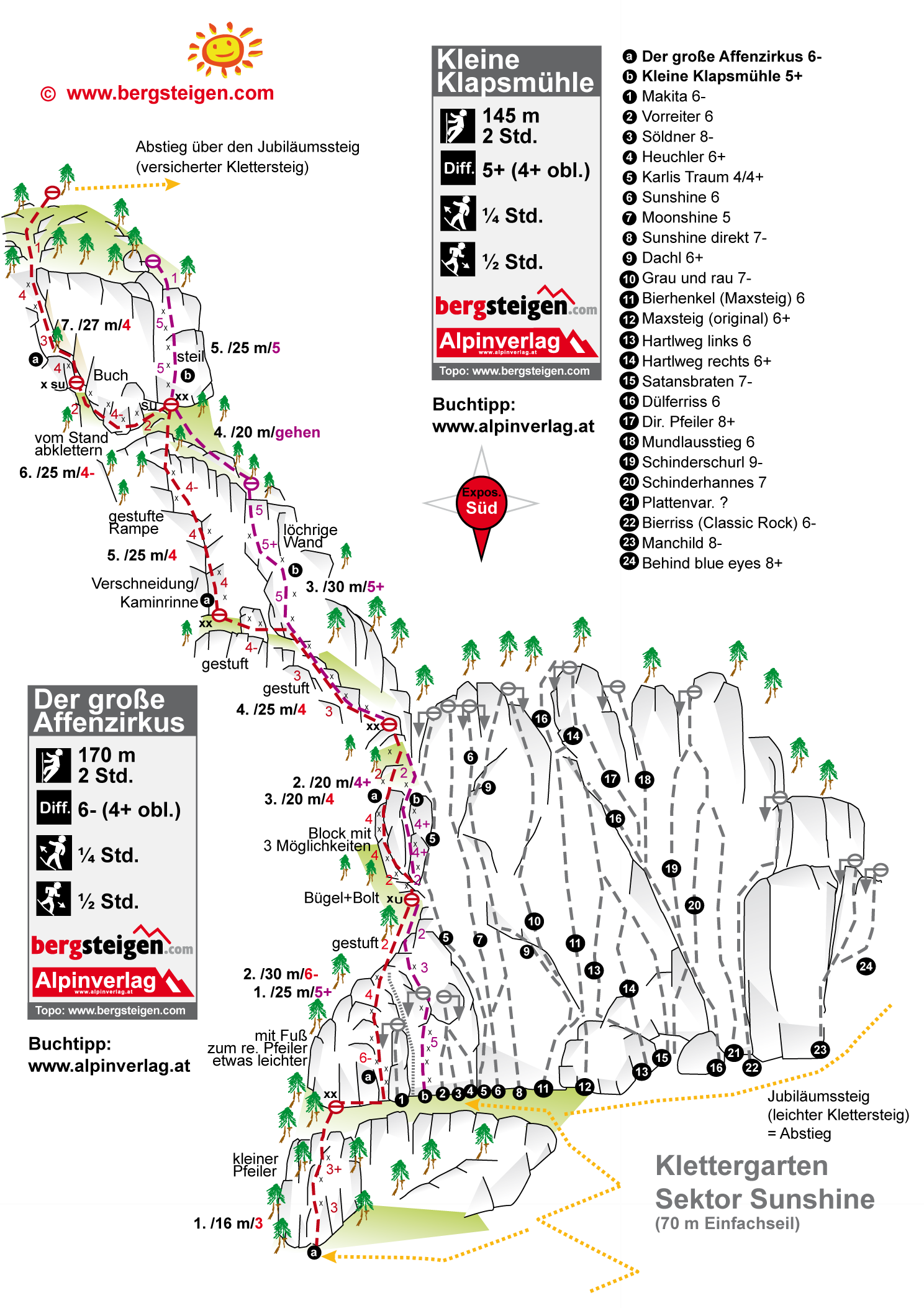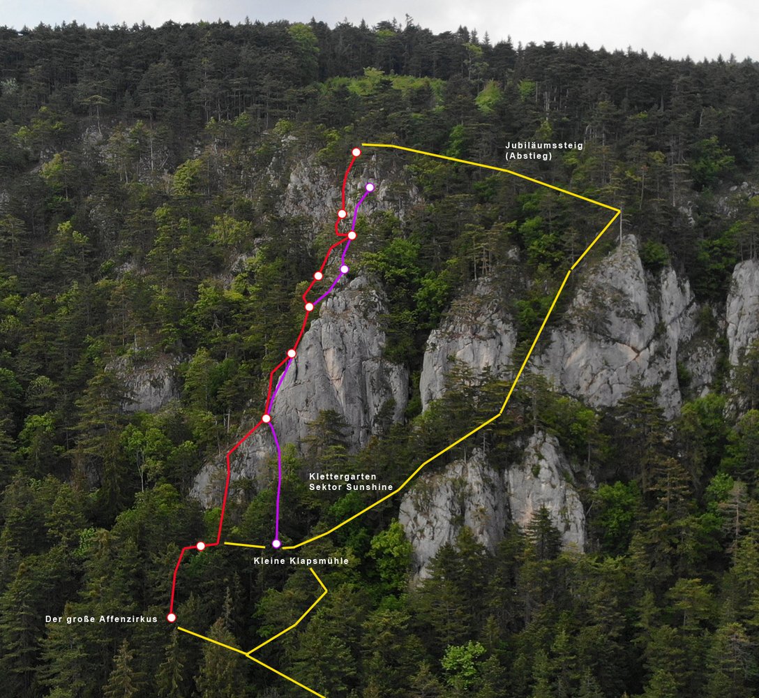 Über die Wiese nach Norden hinauf zum Wald und im Wald leicht rechtshaltend zu einer Forststraße. Auf dieser nach rechts bis, links ein Weg zum Jubiläumssteig führt. Auf diesem unter die Wand und bei den Felsen (Klettergarten Sektor Sunshine) links zum Einstieg etwas unterhalb des Klettergartens bei einem kleinen Pfeiler. „Die kleine Klapsmühle“ steigt etwas höher ein (siehe Topo!).
