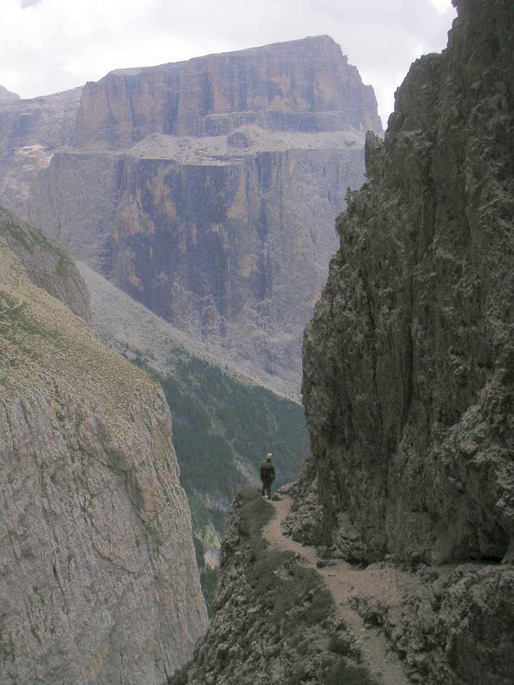 Von Norden über A22 nach Klausen und von hier über Wolkenstein zum Sellajoch hinauf. Vom Sellajoch Richtung Canazei die ersten Serpentinen ca. 120 Hm hinab bis zur ersten langen, leicht rechts gekrümmten Geraden mit Parkmöglichkeiten am Straßenrand, ca. 2080 m. Von hier ist die Südwand sehr gut einsehbar.