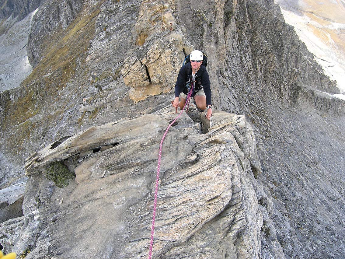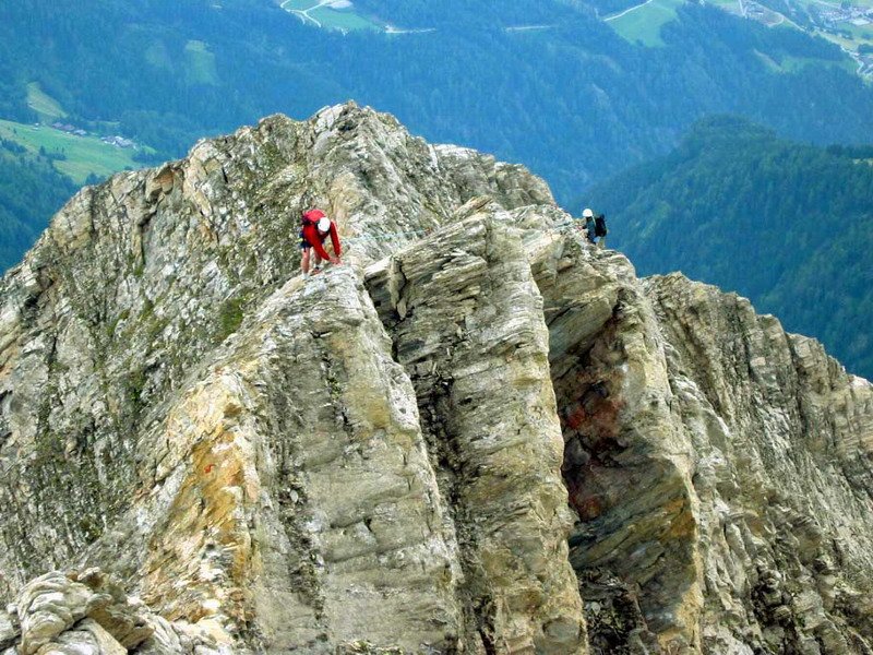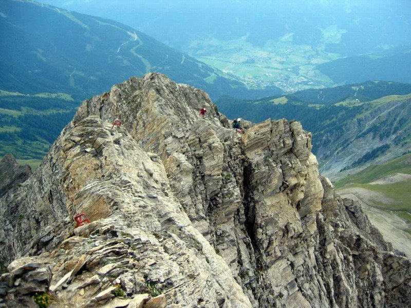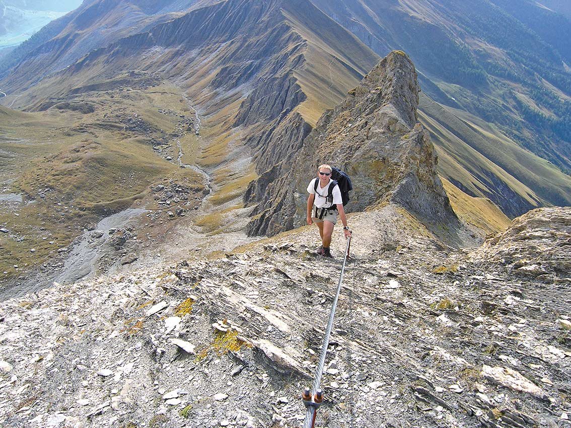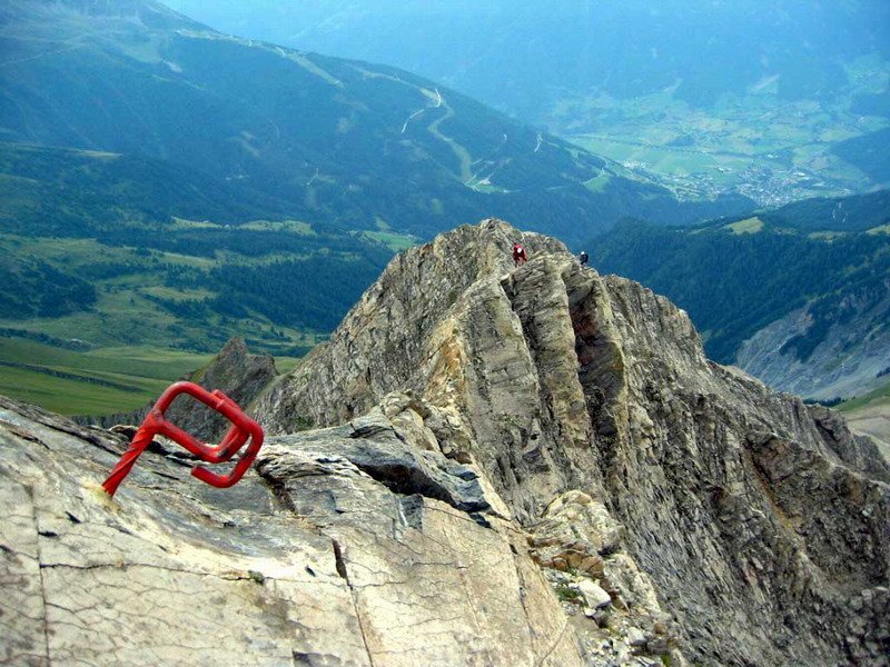 Der Klettergrat ist mit sog. Theniushaken ausgerüstet (Stand 2013). In diese wird das Seil hineingelegt und kann nicht mehr herausrutschen. Alternativ können auch Expressschlingen eingehängt werden, da ist aber auf weite Karabineröffnungen zu achten (wegen der dicken Stahlstangen der Theniushaken). Gratkletterei ohne Fluchtweg - auf stabile Wetterverhältnisse ist zu achten!