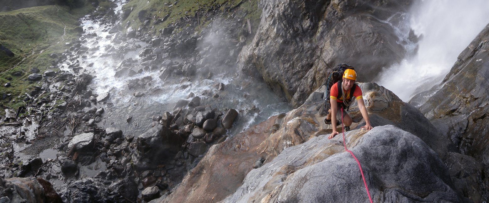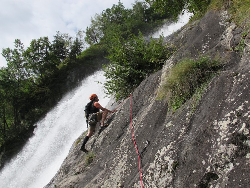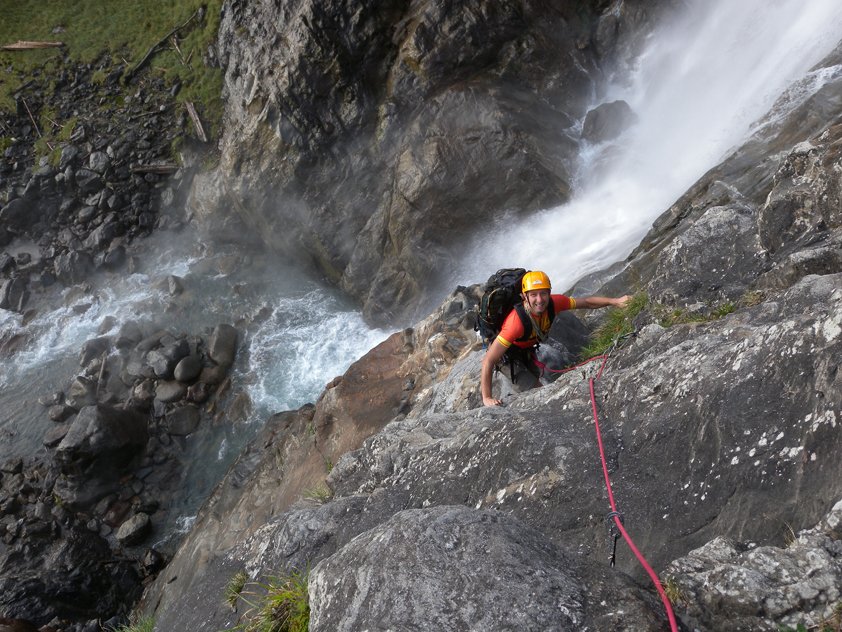 Die Tour verläuft direkt neben dem großen Wasserfall - vor allem bei Wind ist es oft nass! Die linke Möglichkeit in der Mitte und die letzte Seillänge sind bei viel Wasser nicht machbar (nass). Für Führungen und Abseiling empfehlen wir www.bergfuehrer-passeier.com