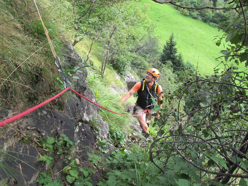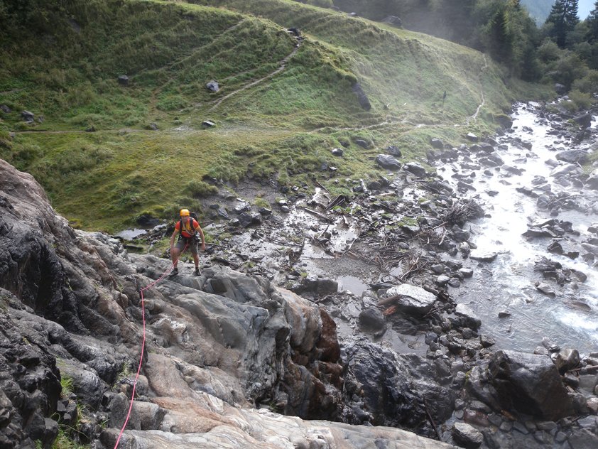 Siehe Topo. Die Route verläuft rechts vom Wasserfall, man kann vor den letzten beiden schwereren Seillängen auch beim Steg abbrechen.