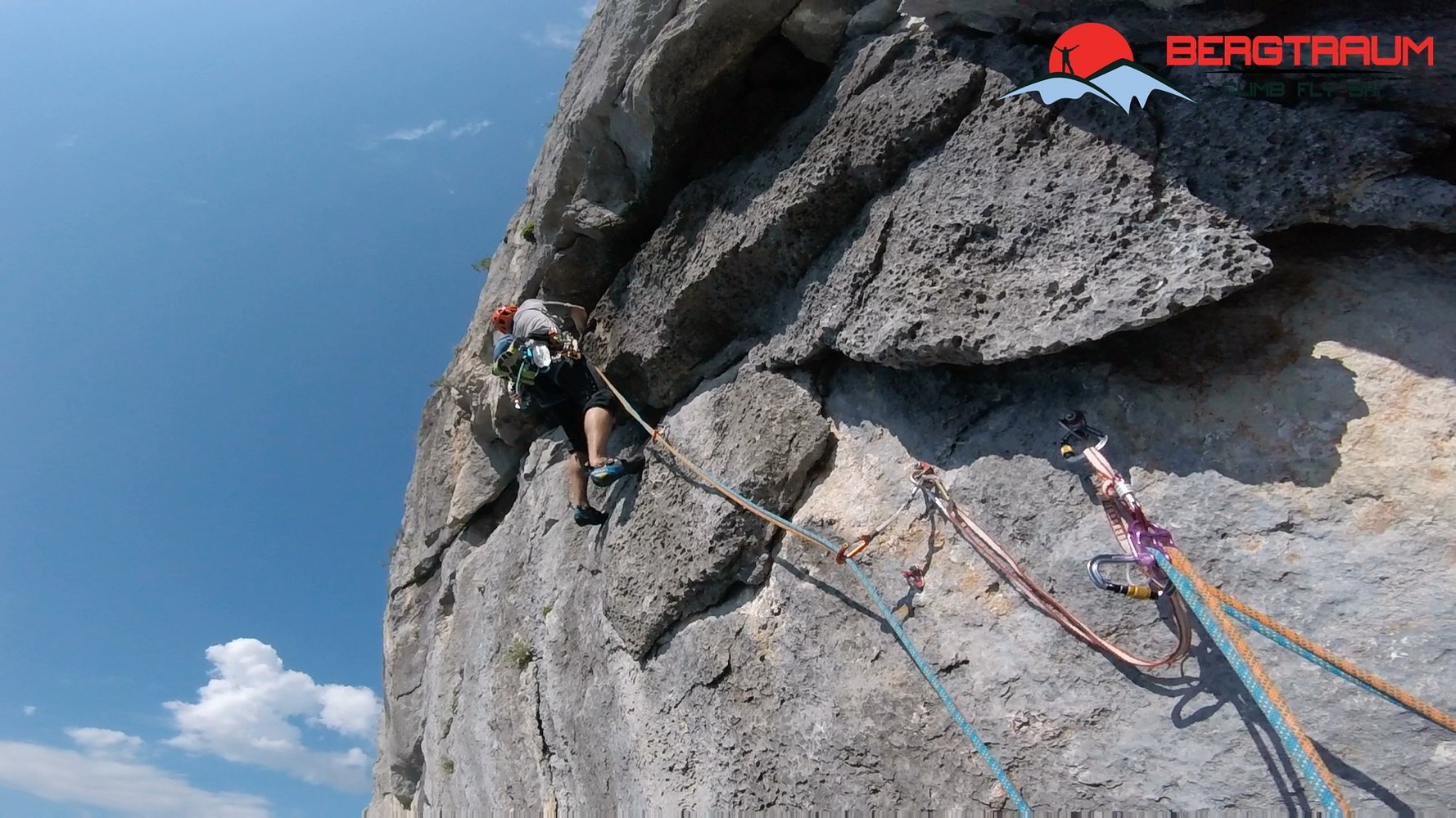 Kletterausürstung, Helm, Bandschlingen, event. einige mittlere Friends.
