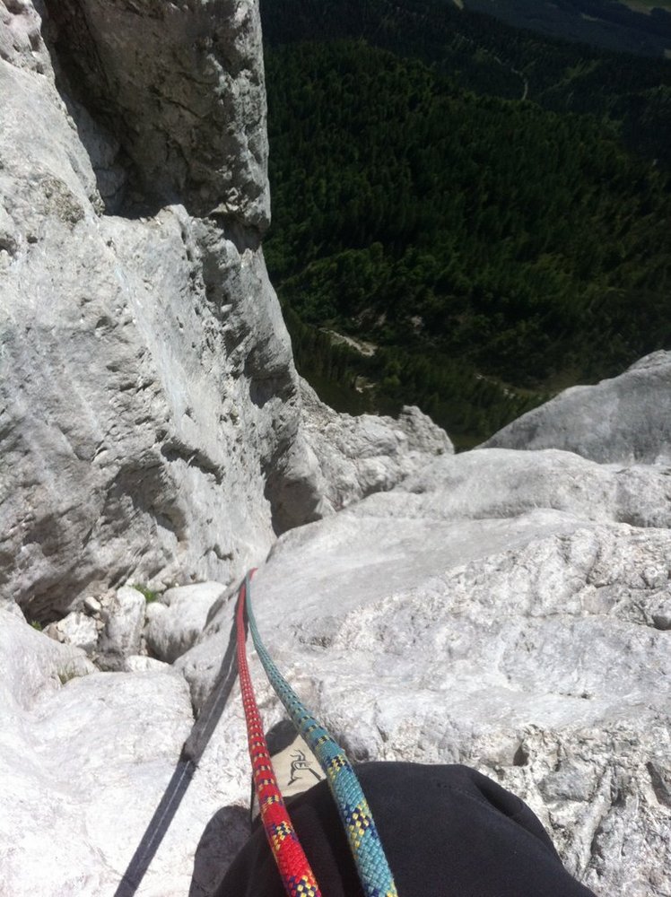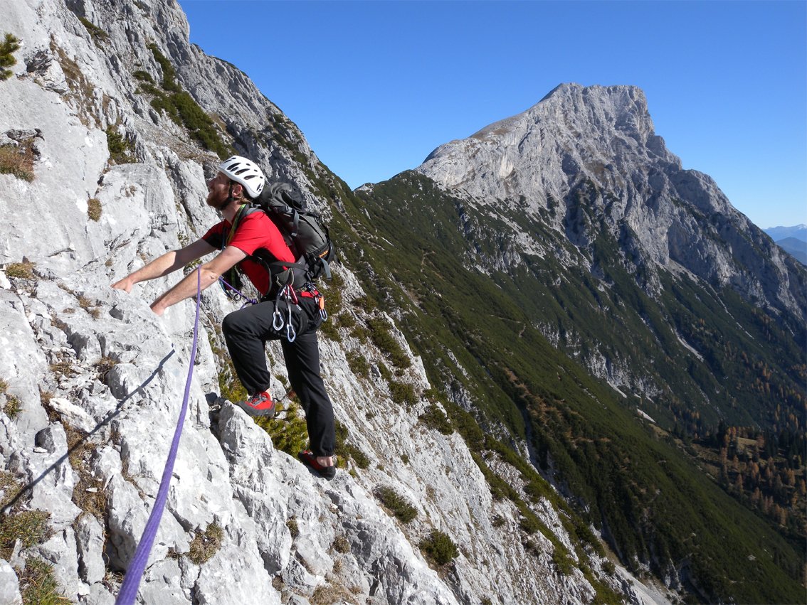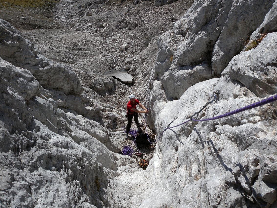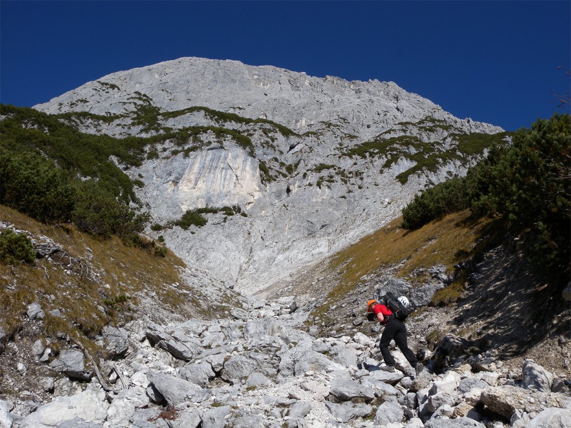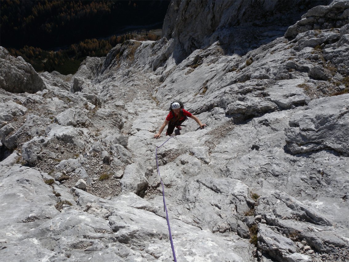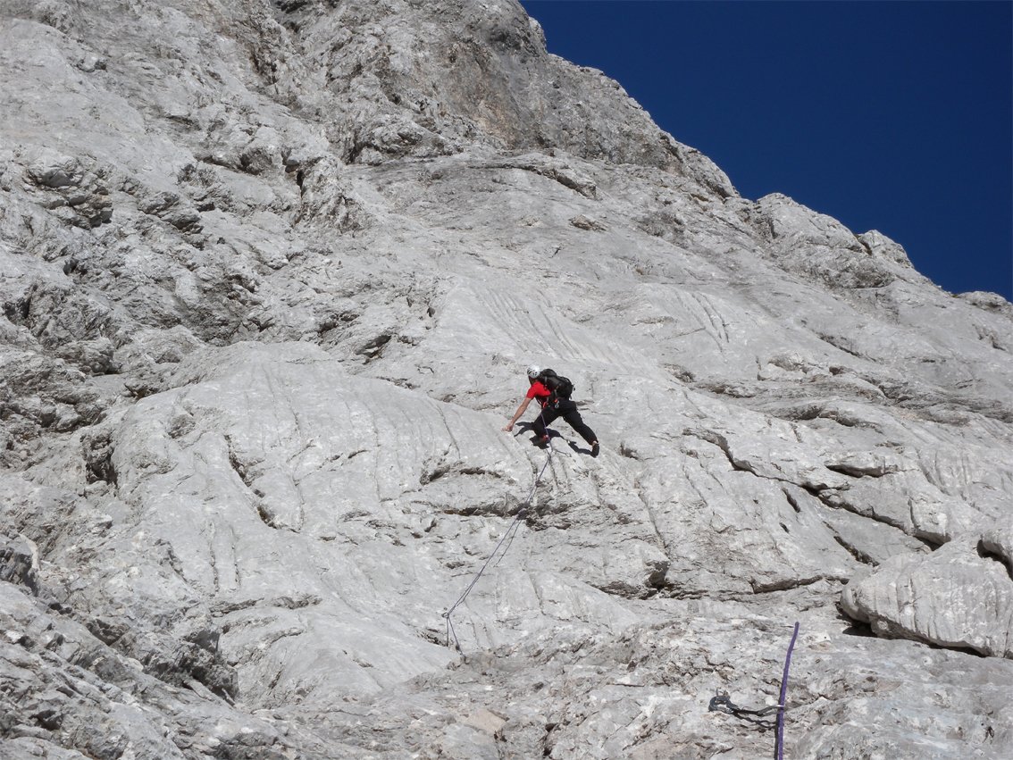 Die Steinschlagproblematik bei mehreren Seilschaften in der Tour ist zu berücksichtigen. Man bewegt sich meist in Rinnen und exponierten Rampen – dort gibt man eine gute Zielscheibe ab. Es liegt einiges an losem Gestein herum…