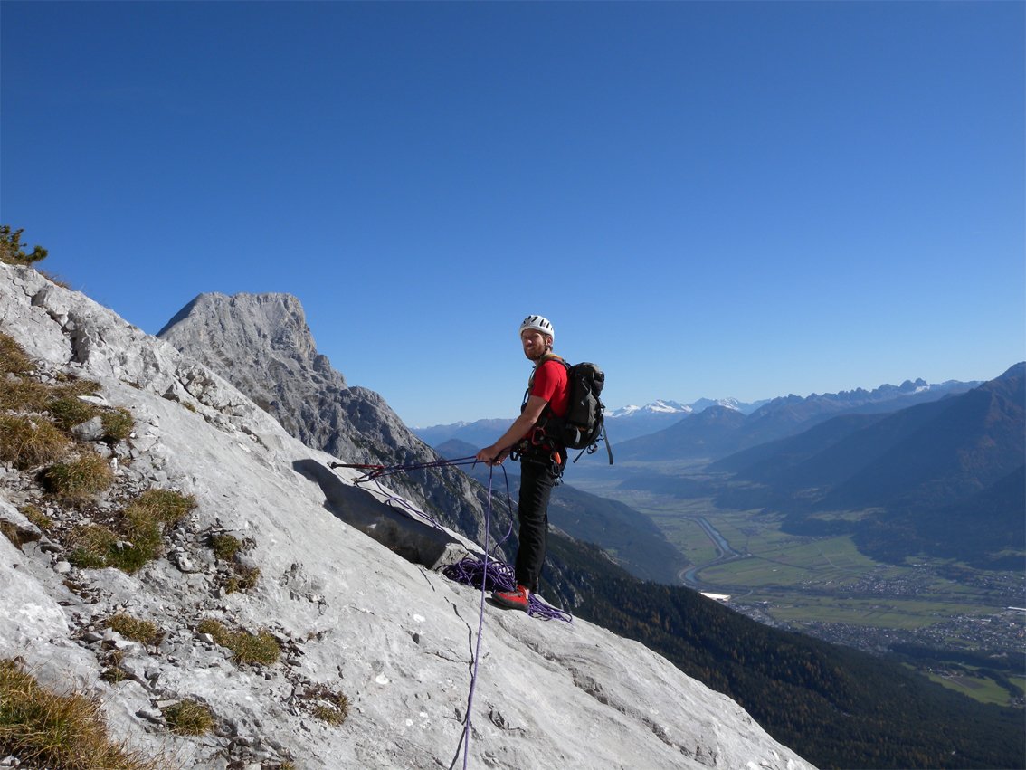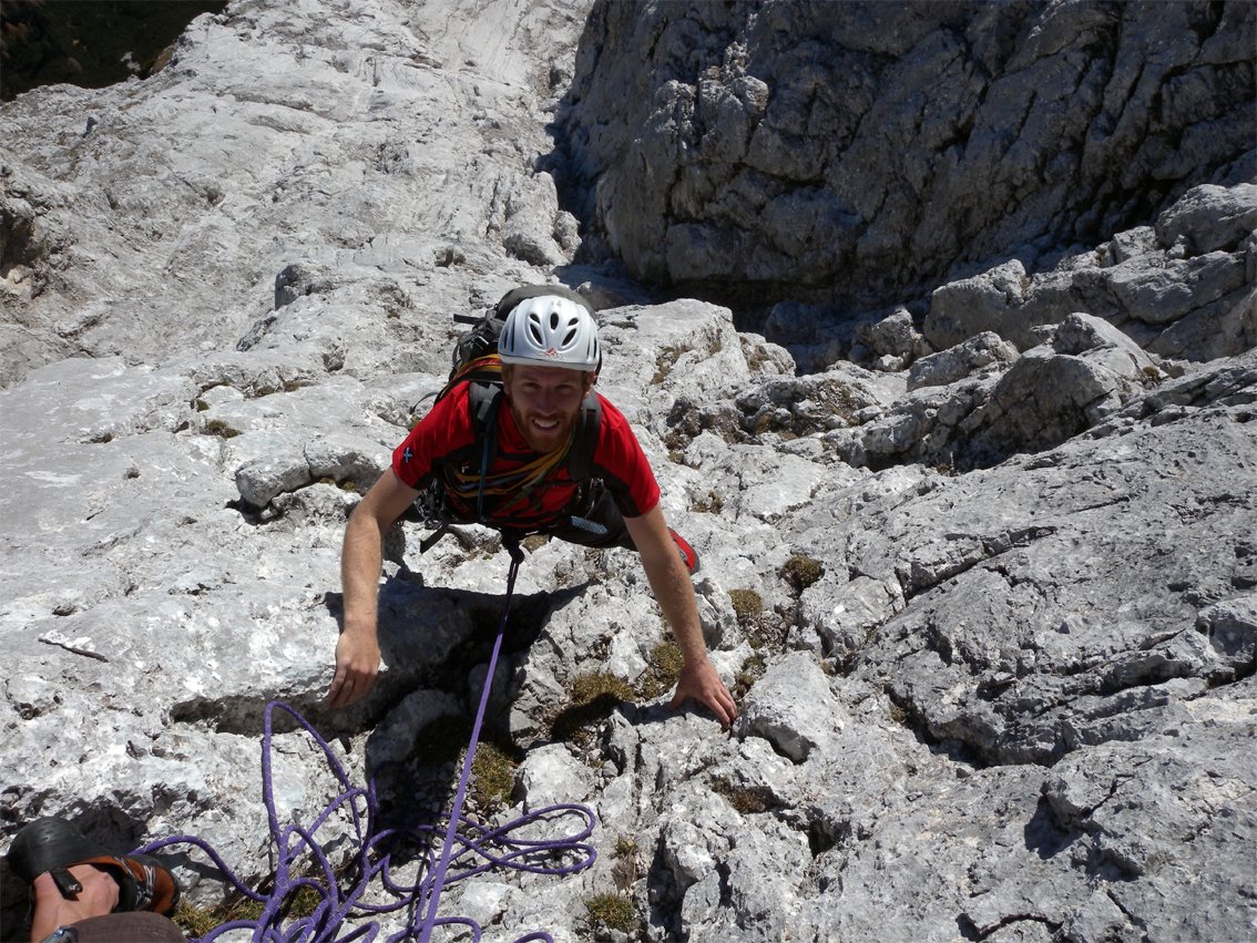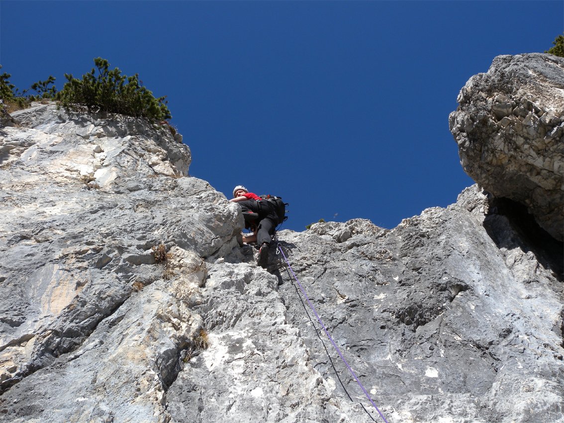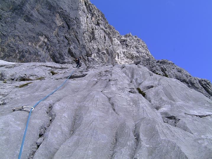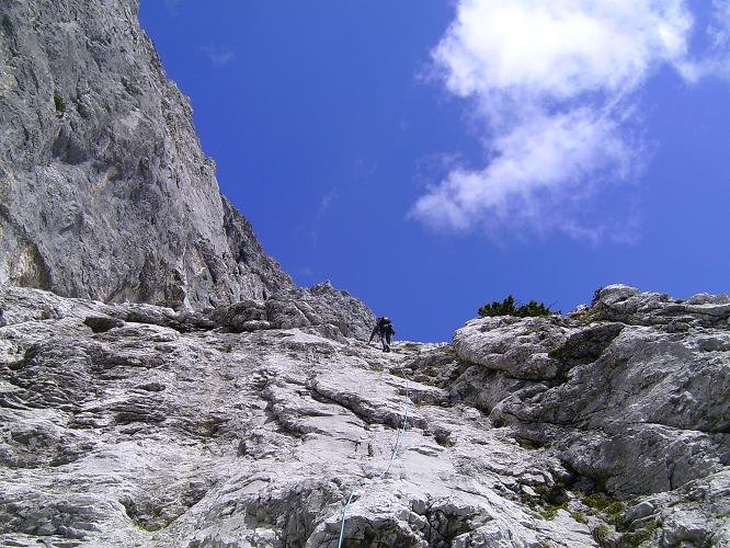 Alpine und sehr lange Sportklettertour durch die Südwand des Karkopfes. Die Route wurde begradigt und mit Bohrhaken gut abgesichert, was die Besucherzahl rapide ansteigen ließ. Die erste Seillänge vermittelt gleich Plaisir-Feeling pur - viele neue Bohrhaken in geringen Abständen und fester Fels, doch von diesem ersten Eindruck sollte man sich nicht blenden lassen. Um die 600 Höhenmeter (1075 Klettermeter) durch die Flanke zu überwinden, muß auch viel im Schrofengelände und teilweise brüchigen Fels geklettert werden - auch ist man dem Steinschlag der Voraussteigenden oft schutzlos ausgesetzt! Trotzdem eine lohnende Tour die trotz guter Absicherung einen recht alpinen Charakter hat.